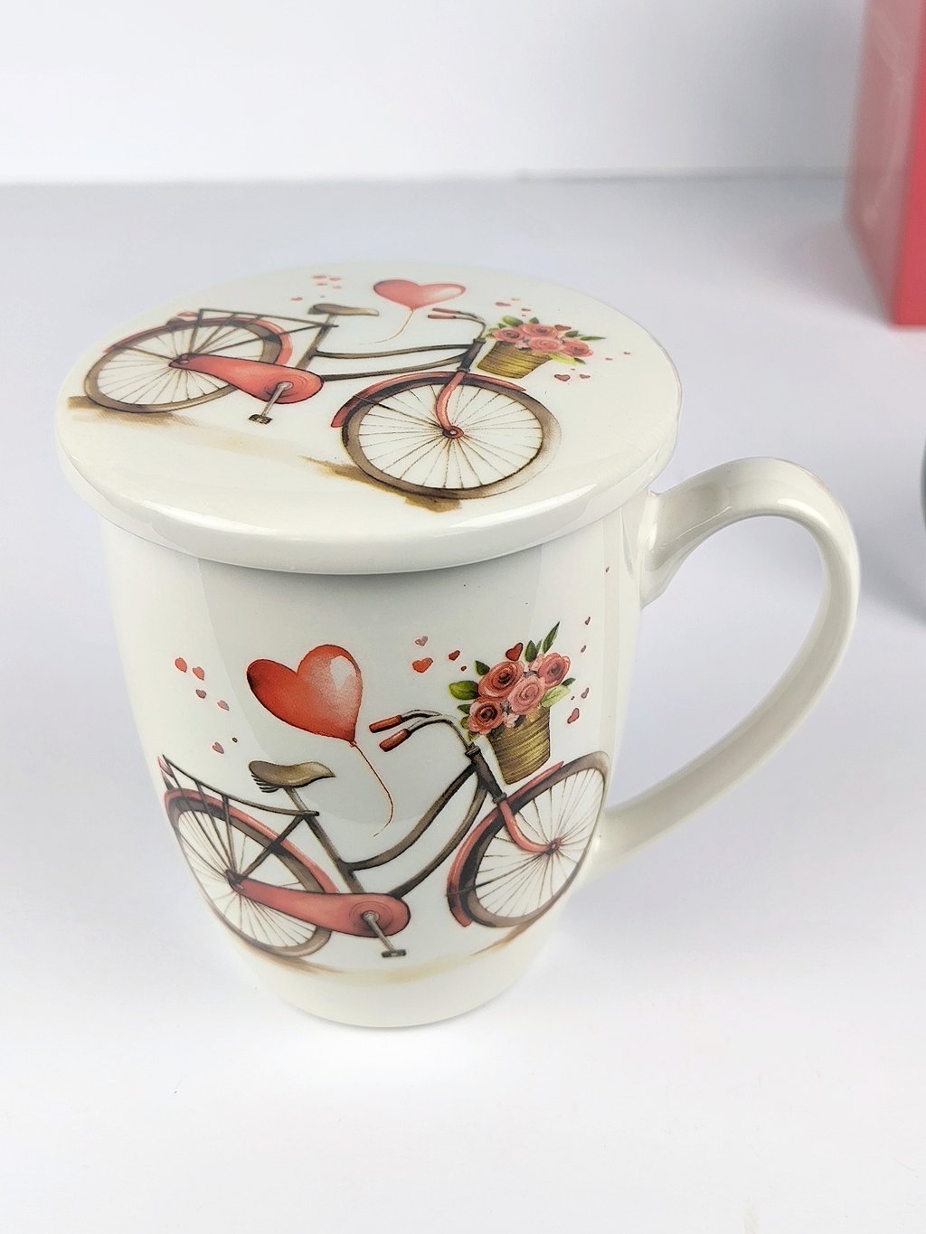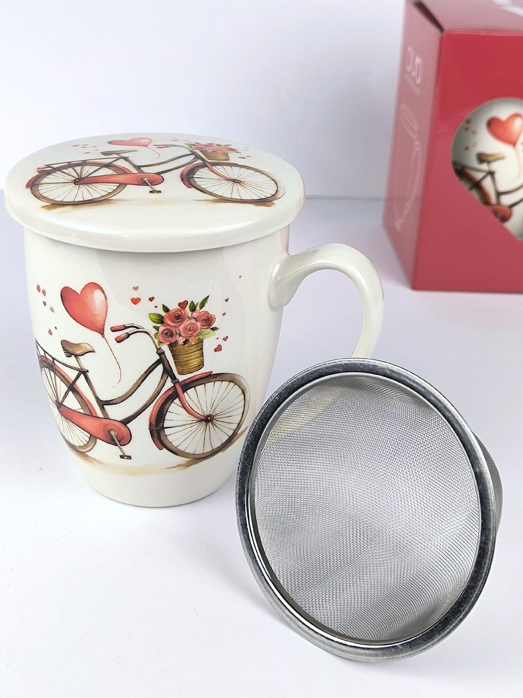- Hrnek je značky DUO porcelain s víčkem a jemným kovovým sítkem