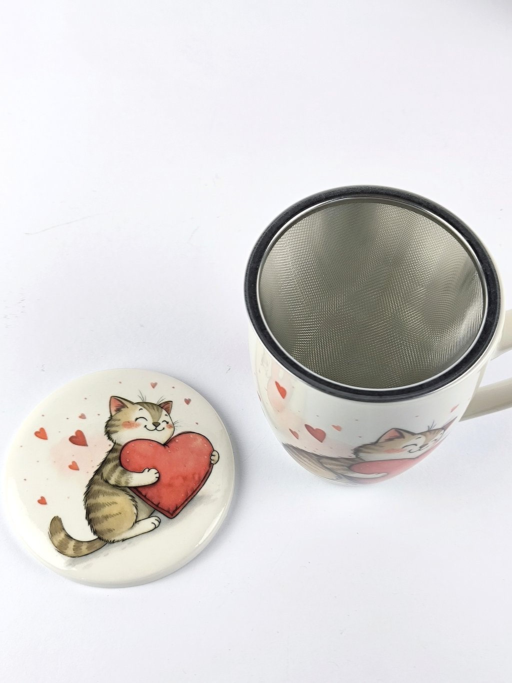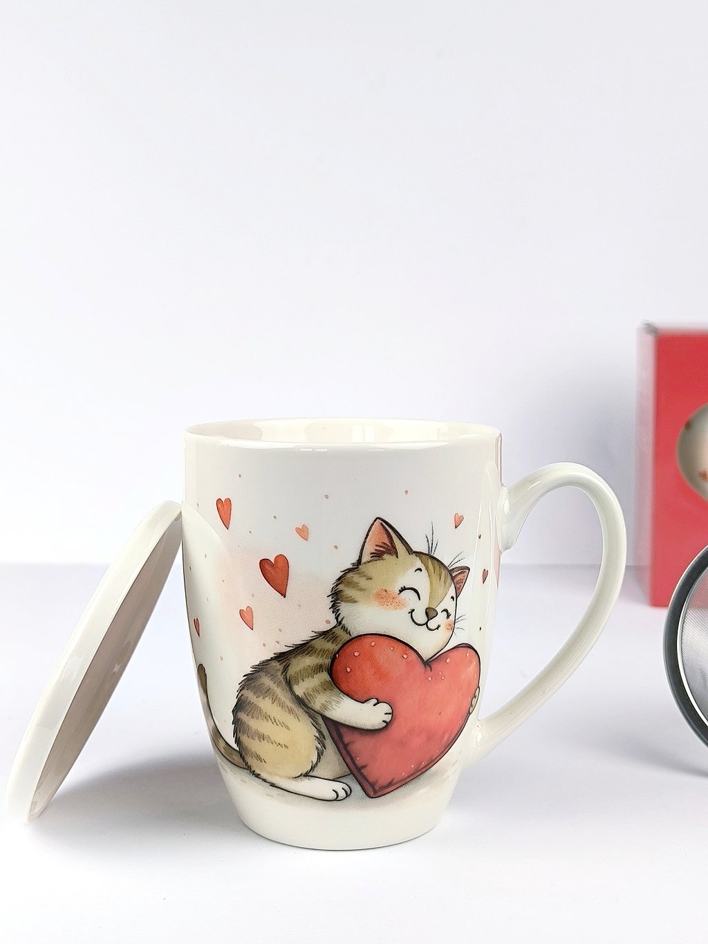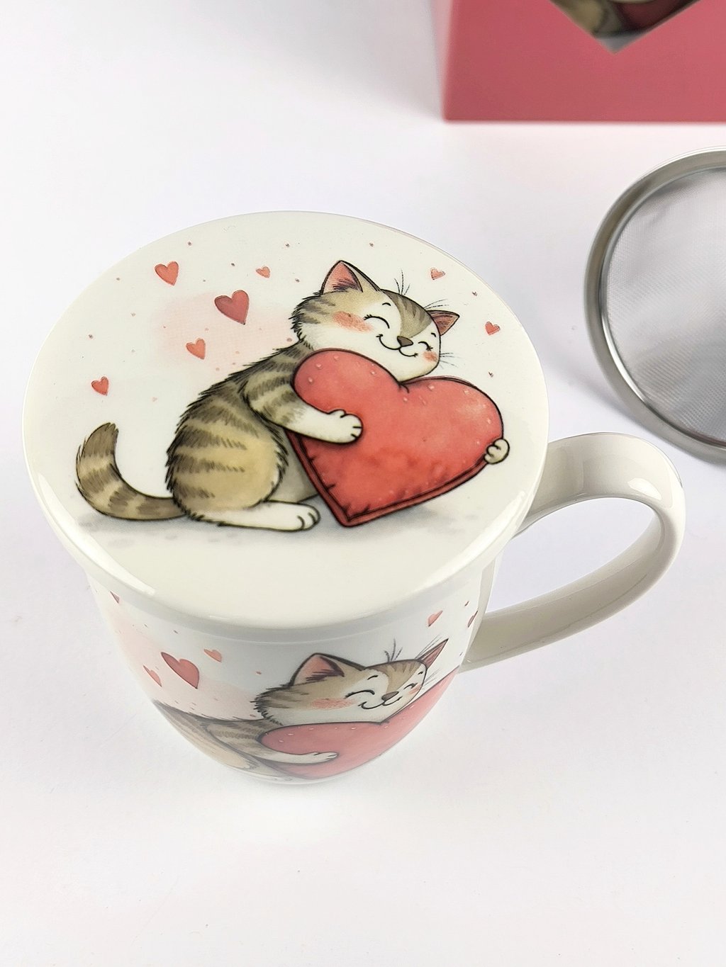 Porcelánový hrníček s roztomilým koťátkem objímajícím srdíčko vykouzlí úsměv na tváři. Hrníček má kovové sítko na bylinky a víčko, aby Váš čaj zůstal co nejdéle teplý.