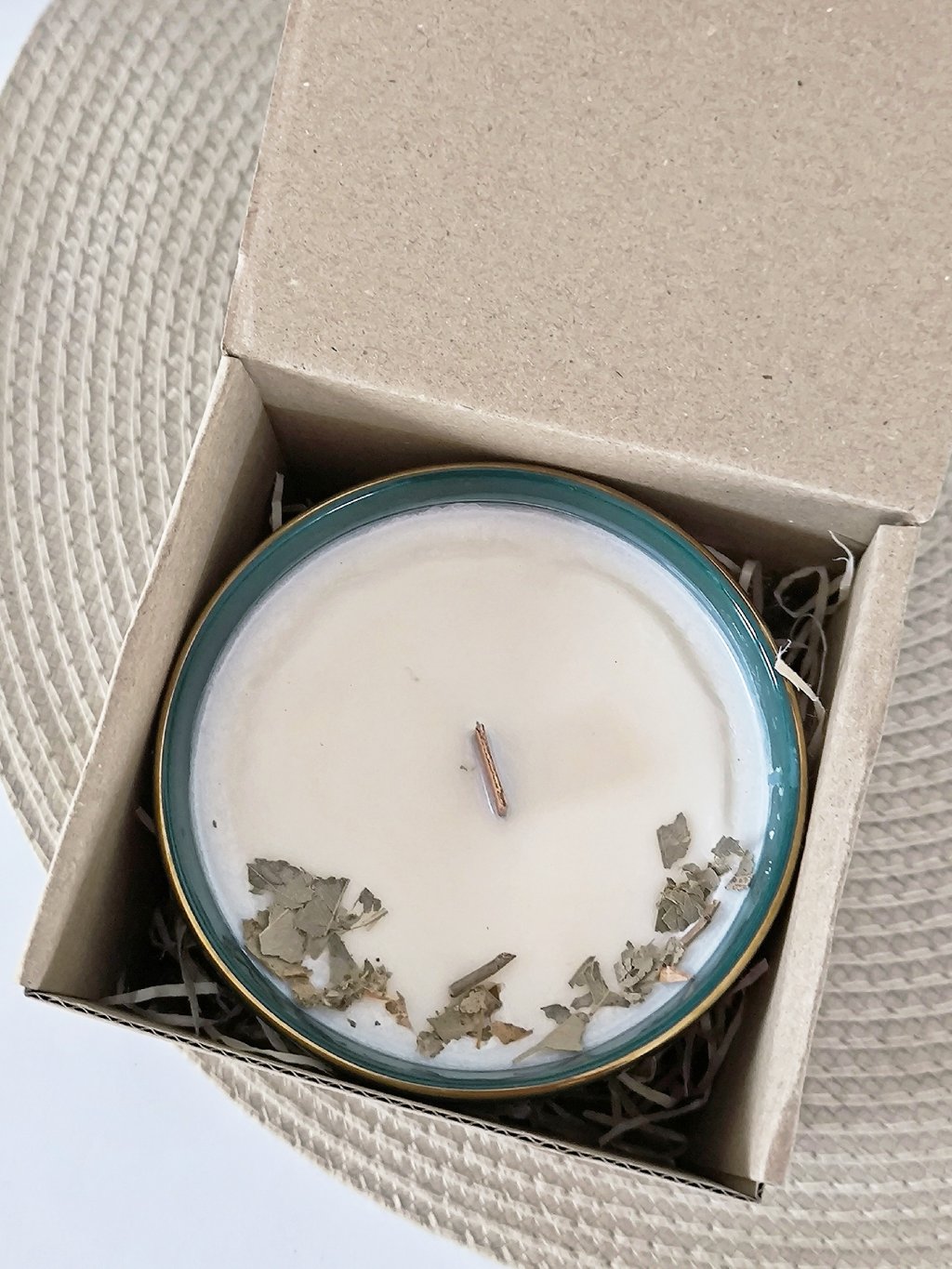 Hmotnost 150 g, délka hoření 15-20 hodin.  Vyrobeno 11/2025. sč.2025122. Výrobce a dodavatel: Michaela Jeníčková, IČO 09596437, Čejkovice 117, 671 78.