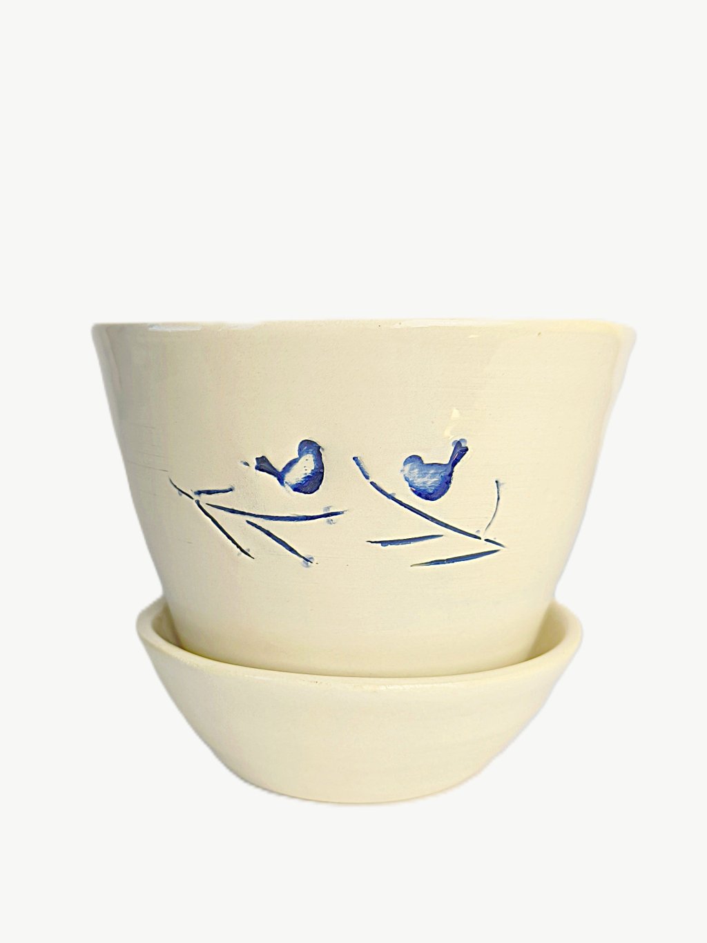 Tento menší ručně vyráběný keramický květináč s ptáčky se bude krásně vyjímat na vašem okně s bylinkami. Květináč má dírku pro odtok vody. Ozdobený jemným motivem ptáčků, vytočený na hrnčířském kruhu a dvakrát vypálený za vysokých teplot, což zaručuje jeho odolnost a kvalitu.