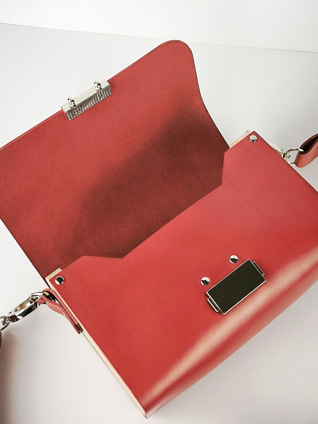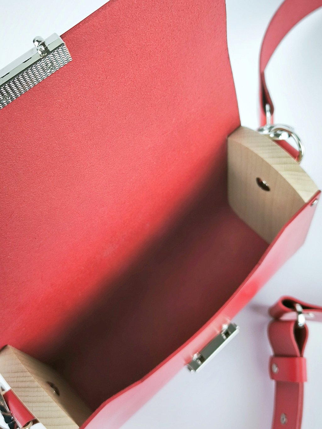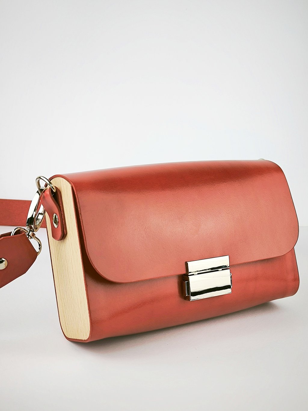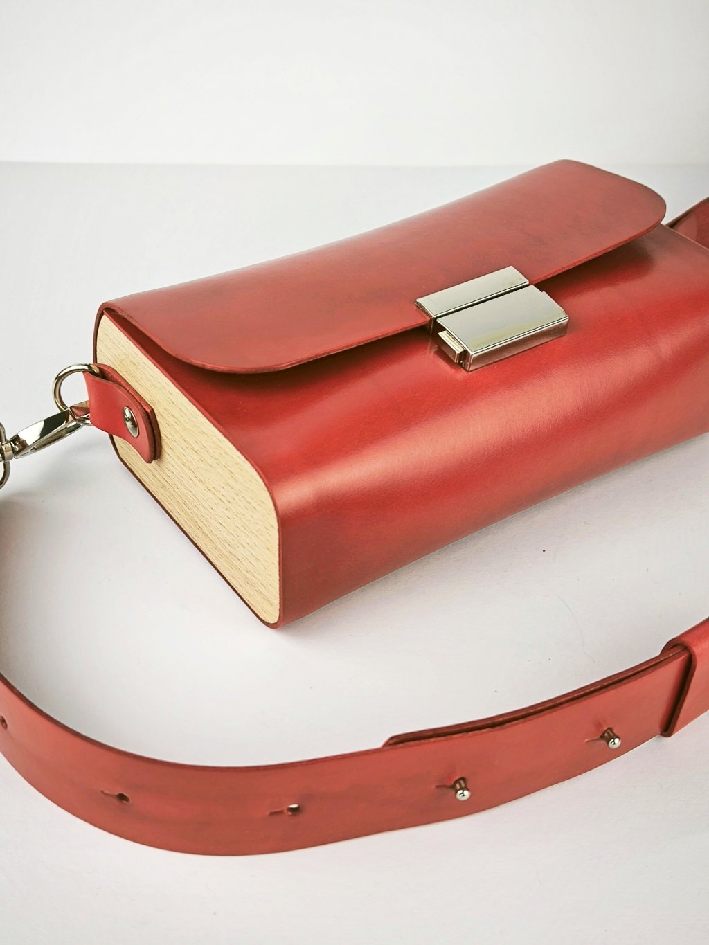 Elegantní kabelka pro ženy, které milují originalitu, přírodní materiály a poctivou ruční práci. Tato stylová kabelka je vyrobena z velmi kvalitní a pevné hovězí kůže v krásné syté červené barvě. Boky kabelky tvoří hladce opracované bukové dřevo, které jí dodává jedinečný vzhled a pevnost.