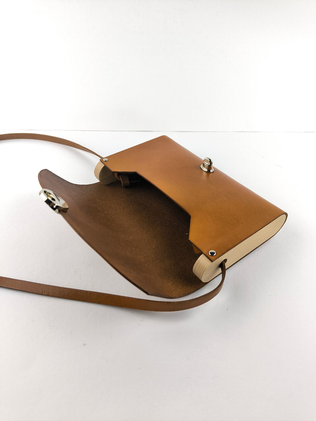 Materiál: přírodní hovězí kůže o tloušťce 2-2,5 mm, bukové dřevo, kovové zapínání ve stříbrné barvě
