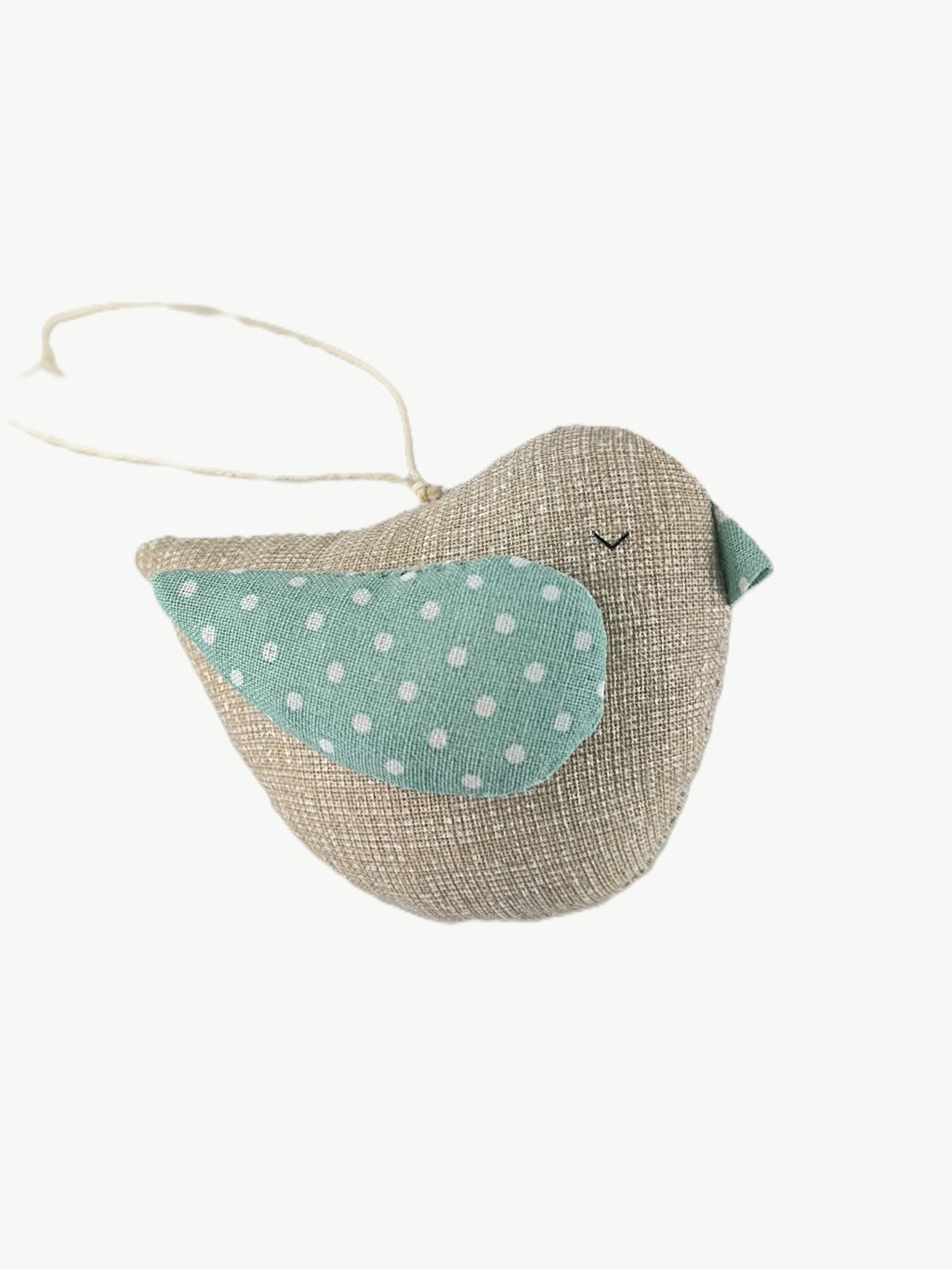 Bavlněný ptáček má očko na zavěšení. Je ušitý z bavlněné látky, vnitřek je vyplněný dutým vláknem.