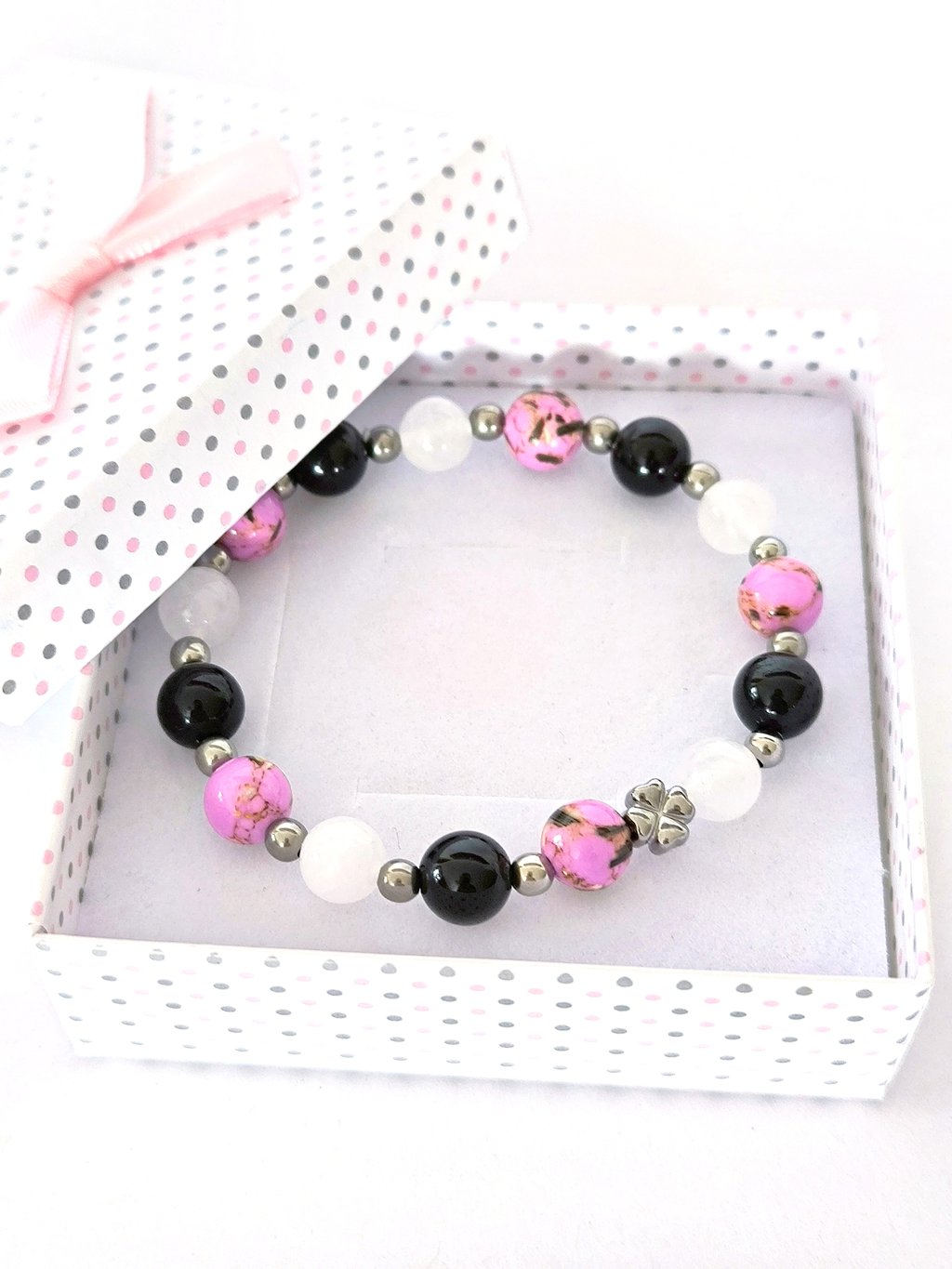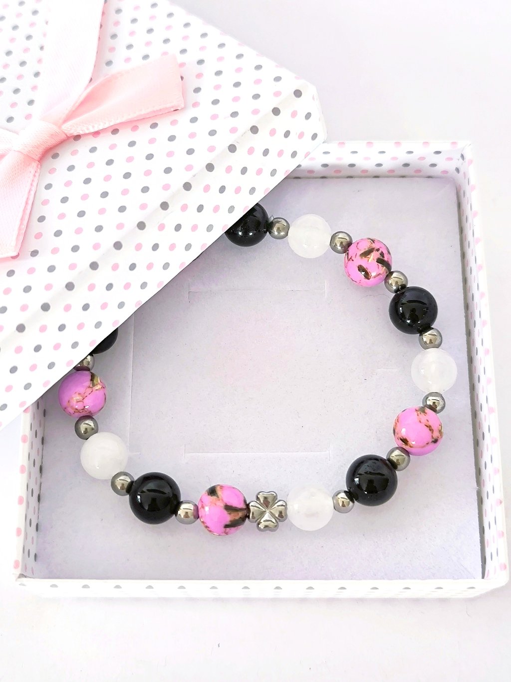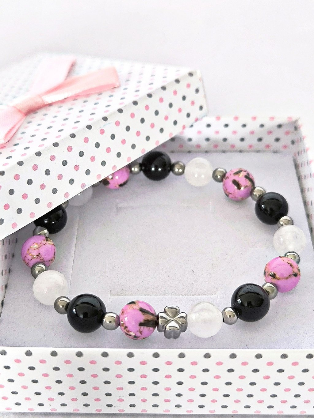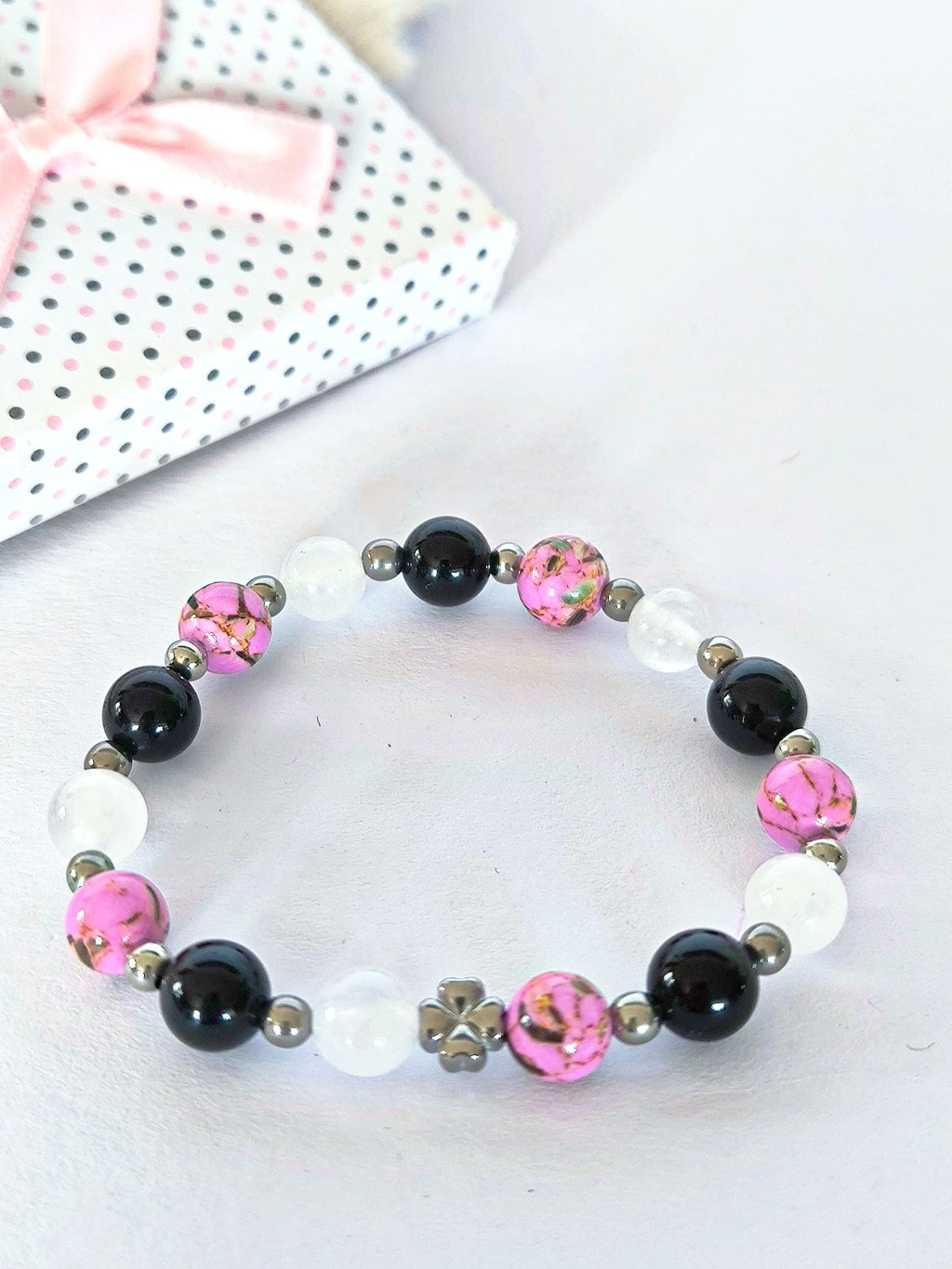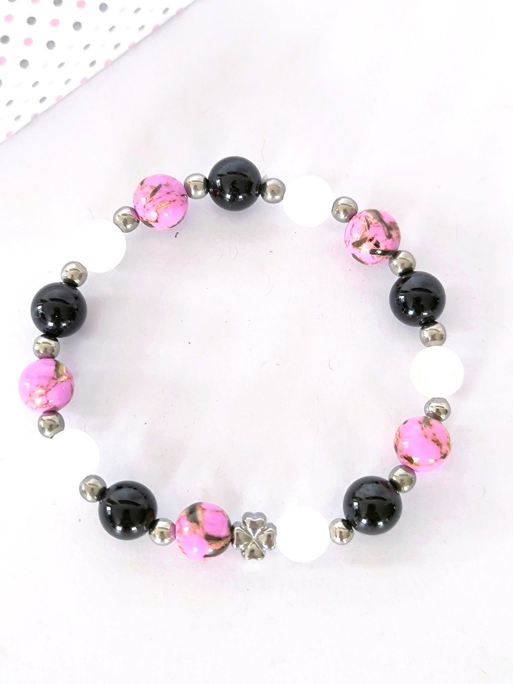 Náramek je ručně navlékaný z korálků z přírodního nebarveného nefritu, černé korálky jsou z přírodního onyxu a růžové z tyrkenitu s perletí.