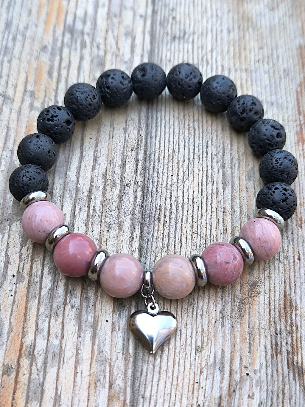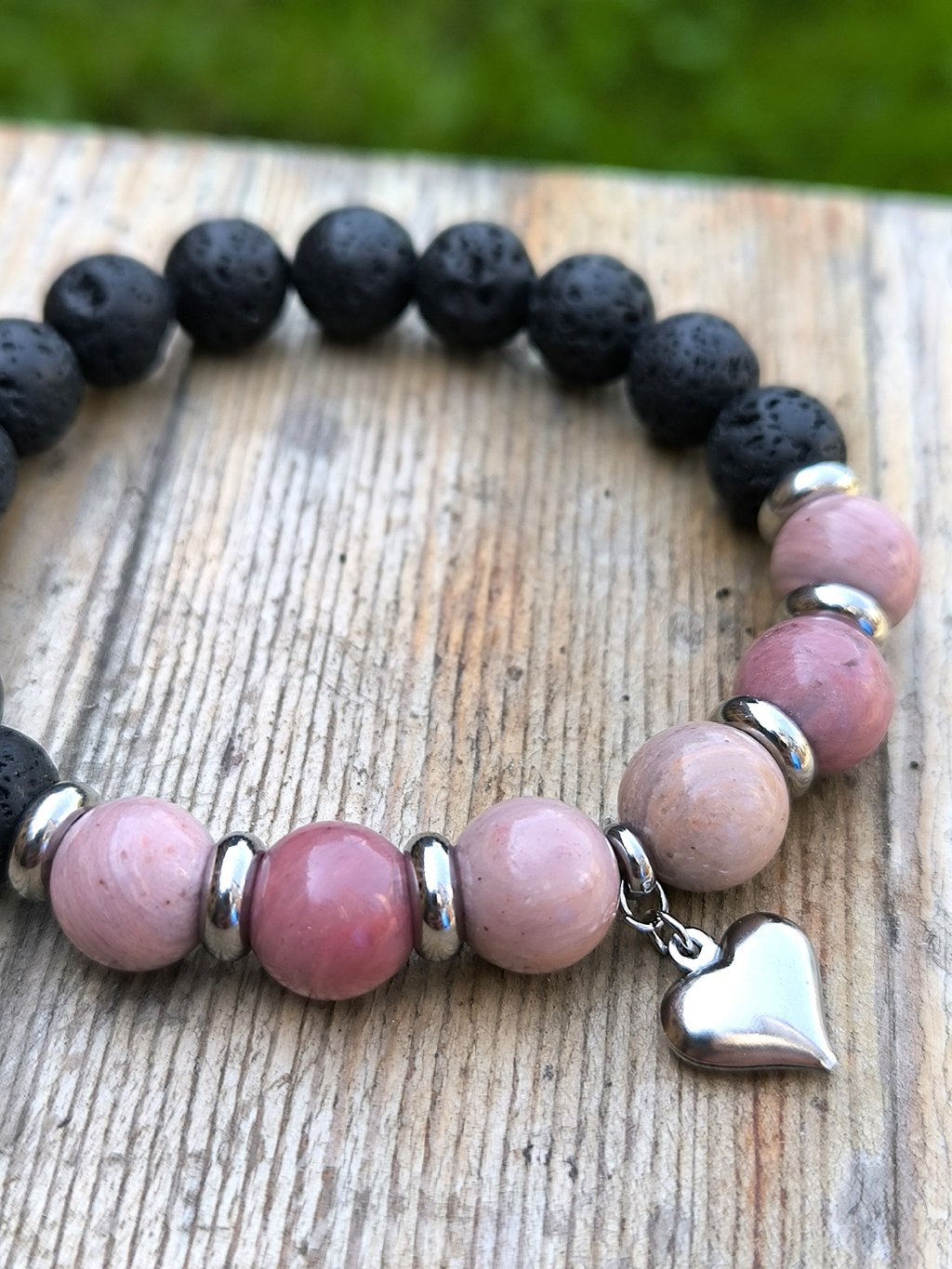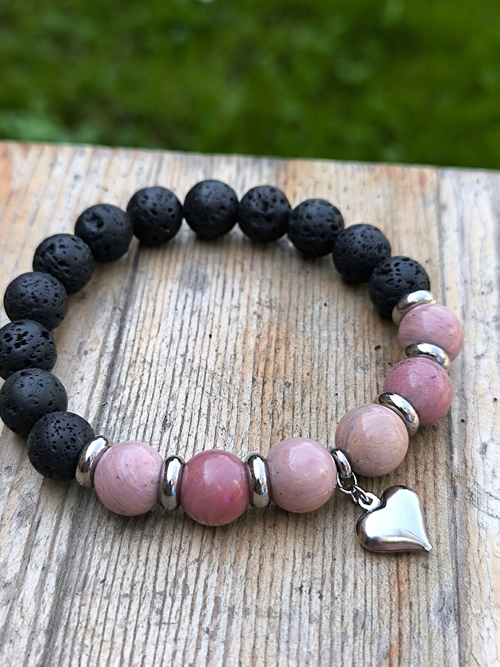 Černá a růžová – kontrast, který prostě funguje. Matný lávový kámen dodává náramku drsnější charakter, rodonit přidává jemnost a špetku elegance. Kovové komponenty jsou z nerezové oceli.