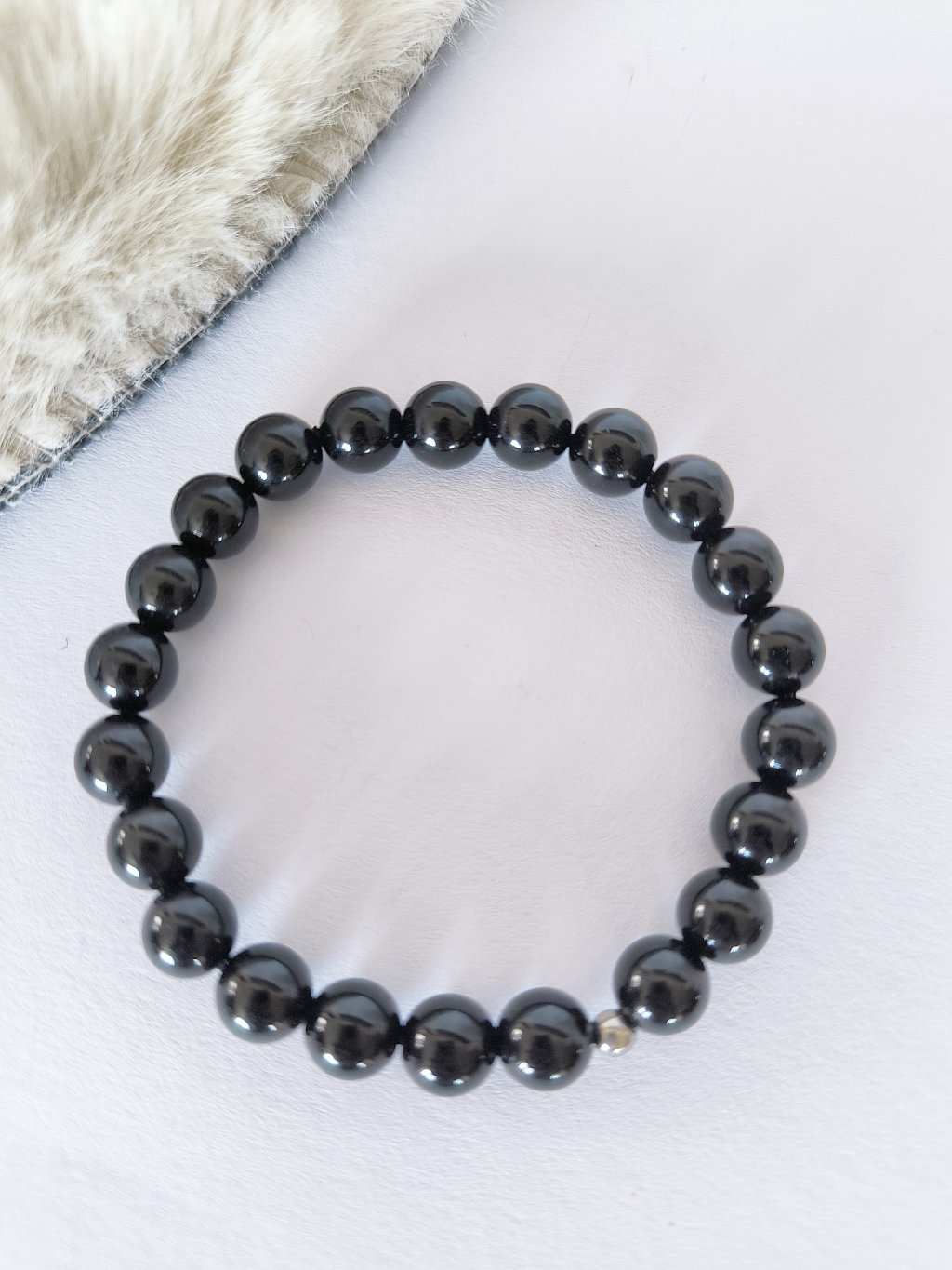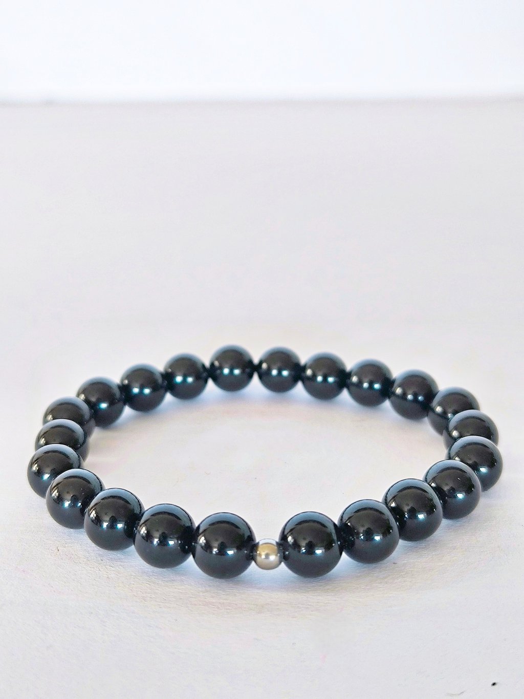 Náramek v oblíbeném minimalistickém stylu je ozdoben pouze malým korálkem z kvalitní chirurgické oceli. Jednoduchý, přesto stylový módní doplněk. Náramek je navlečený na pružném lanku, takže pohodlně padne na většinu zápěstí.