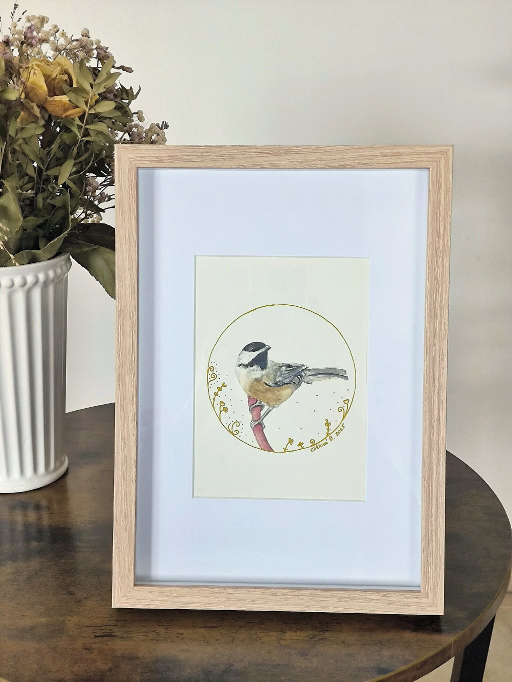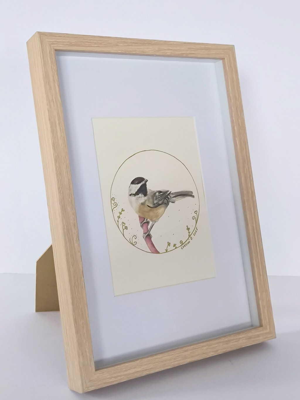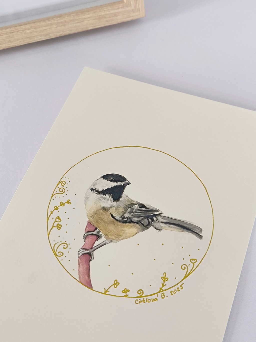 Jemný akvarelový obrázek malého ptáčka - červenky, kterého můžete zahlédnout v lesích, v parku, ale i na zahradě. Tento originální ručně malovaný obraz je zasazen do kvalitního dubového rámečku s paspartou se sklem.