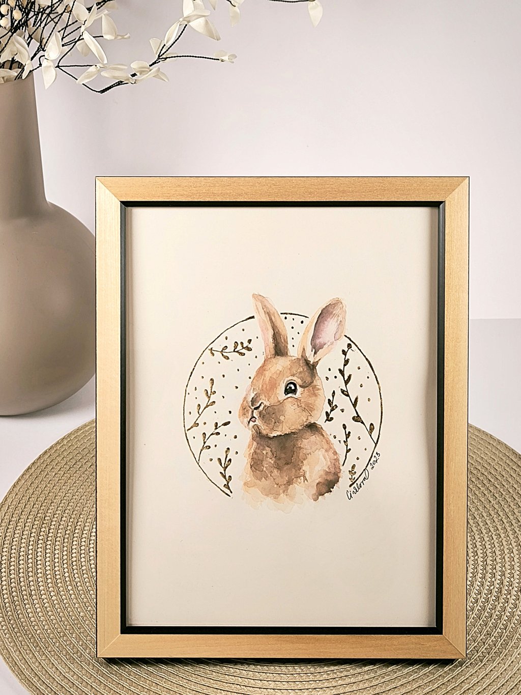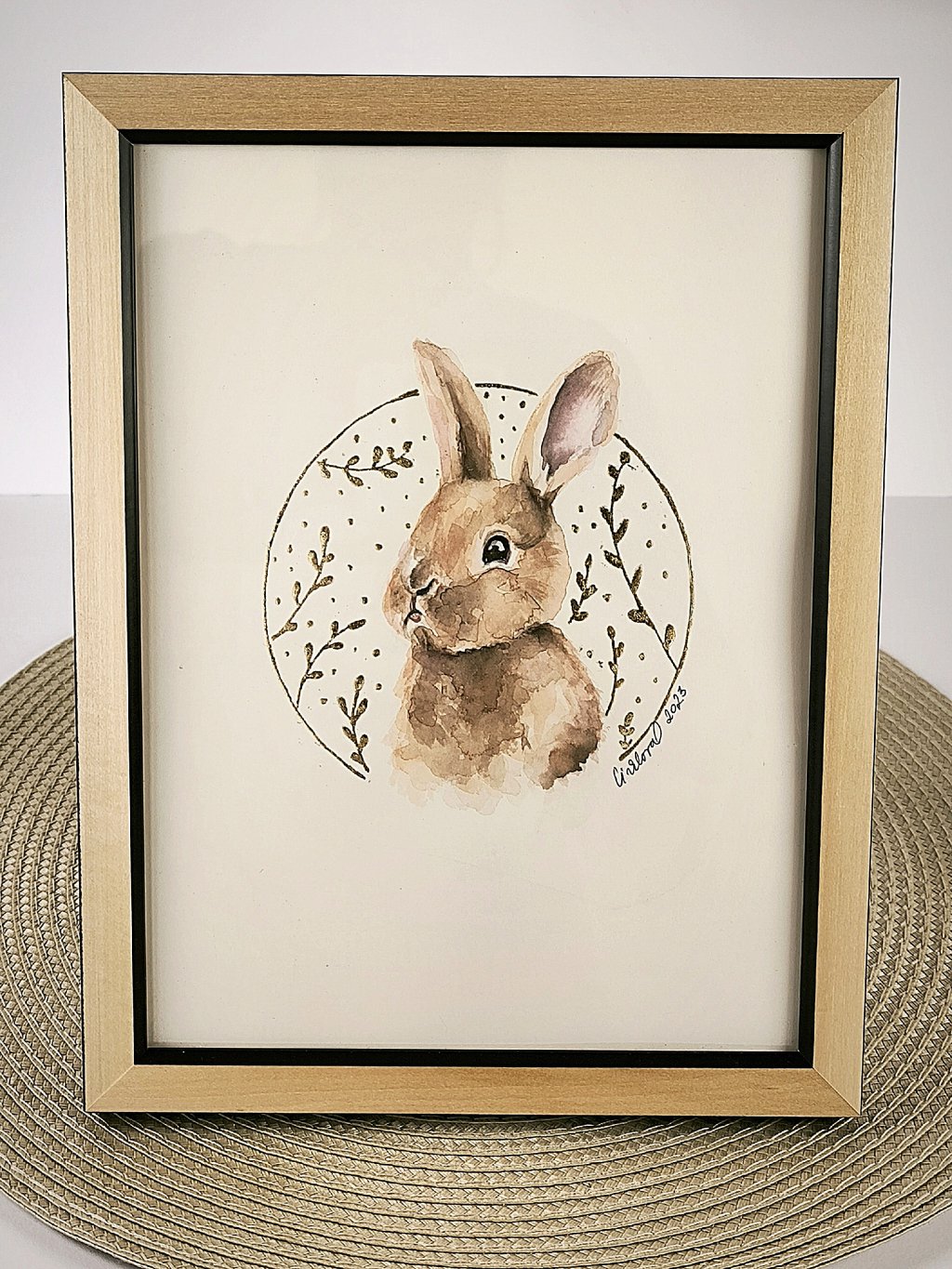 Obrázek malého zajíčka pohladí svou něžností a roztomilostí. Obrázek je namalován akvarelovými barvami na velmi kvalitním papíru, je dřevěném rámečku. Zajíček je orámován kolečkem s větvičkami ve zlaté barvě. Ručně malováno, jedná se o originální dílo.