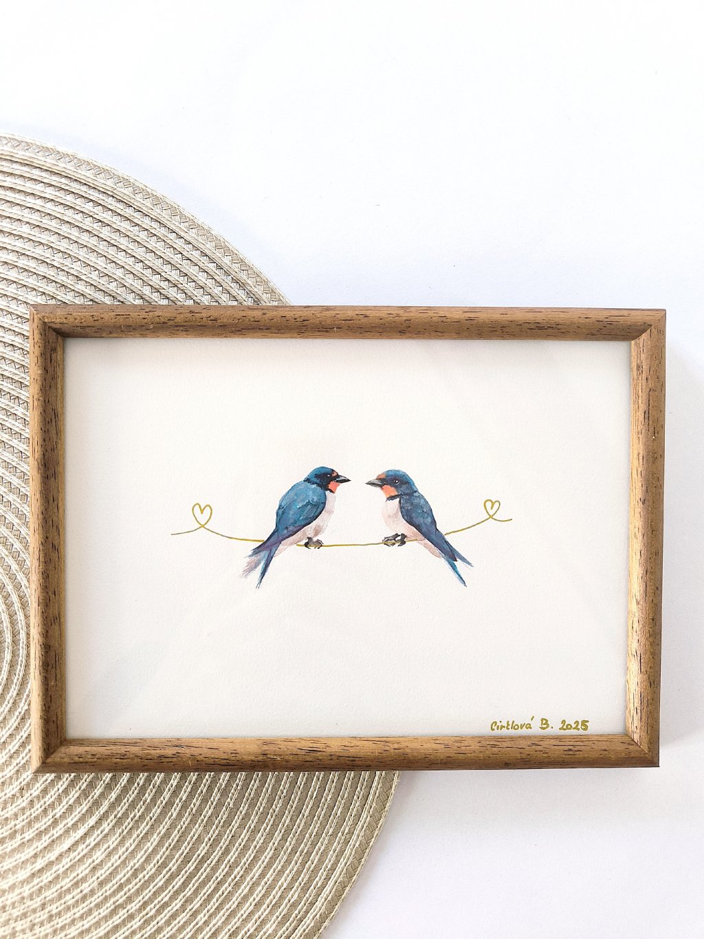 Zamilované vlaštovky sedící na drátě symbolizující lásku a věrnost potěší nejen milovníky ptáčků. Skvěle se bude třeba hodit i jako svatební dar novomanželům.