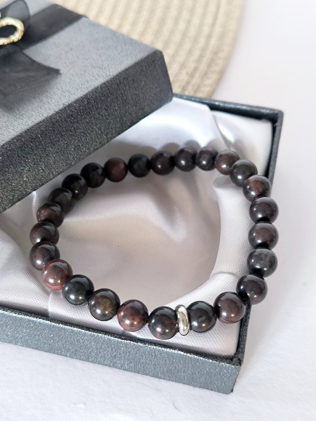 Pánský náramek z přírodního tmavě červeného jaspisu, známého jako „Dračí krev“, který tento název získal díky tmavě červené barvě připomínající krev. Každý korálek je unikátní, s jemnými tmavšími žilkami, které dodávají náramku autentický přírodní vzhled.