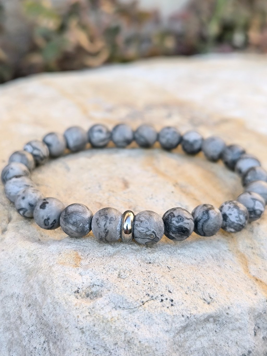 Pánský náramek z přírodního šedého jaspisu, korálky jsou v matném provedení. Šedý jaspis patří mezi oblíbené kameny pro svou nenápadnou, ale výraznou kresbu. Každý korálek je jiný – od světle šedých tónů až po tmavší odstíny s jemným žíháním. Díky tomu působí náramek elegantně a přitom zůstává univerzálním doplňkem pro každodenní nošení.