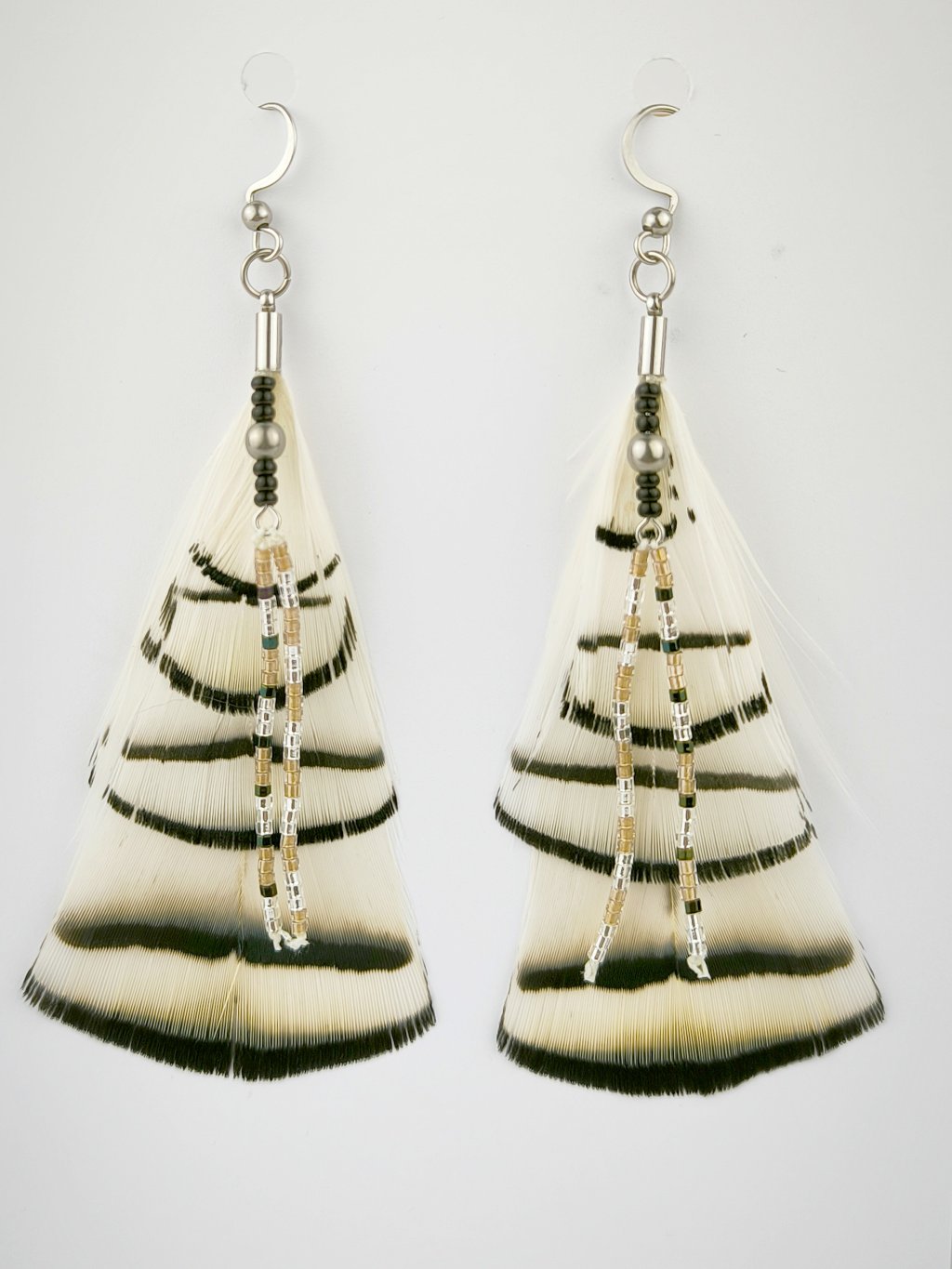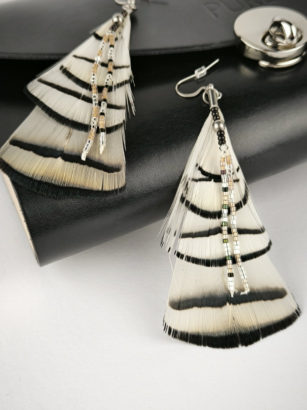 Náušnice z pravého nebarveného peří bažanta diamantového.