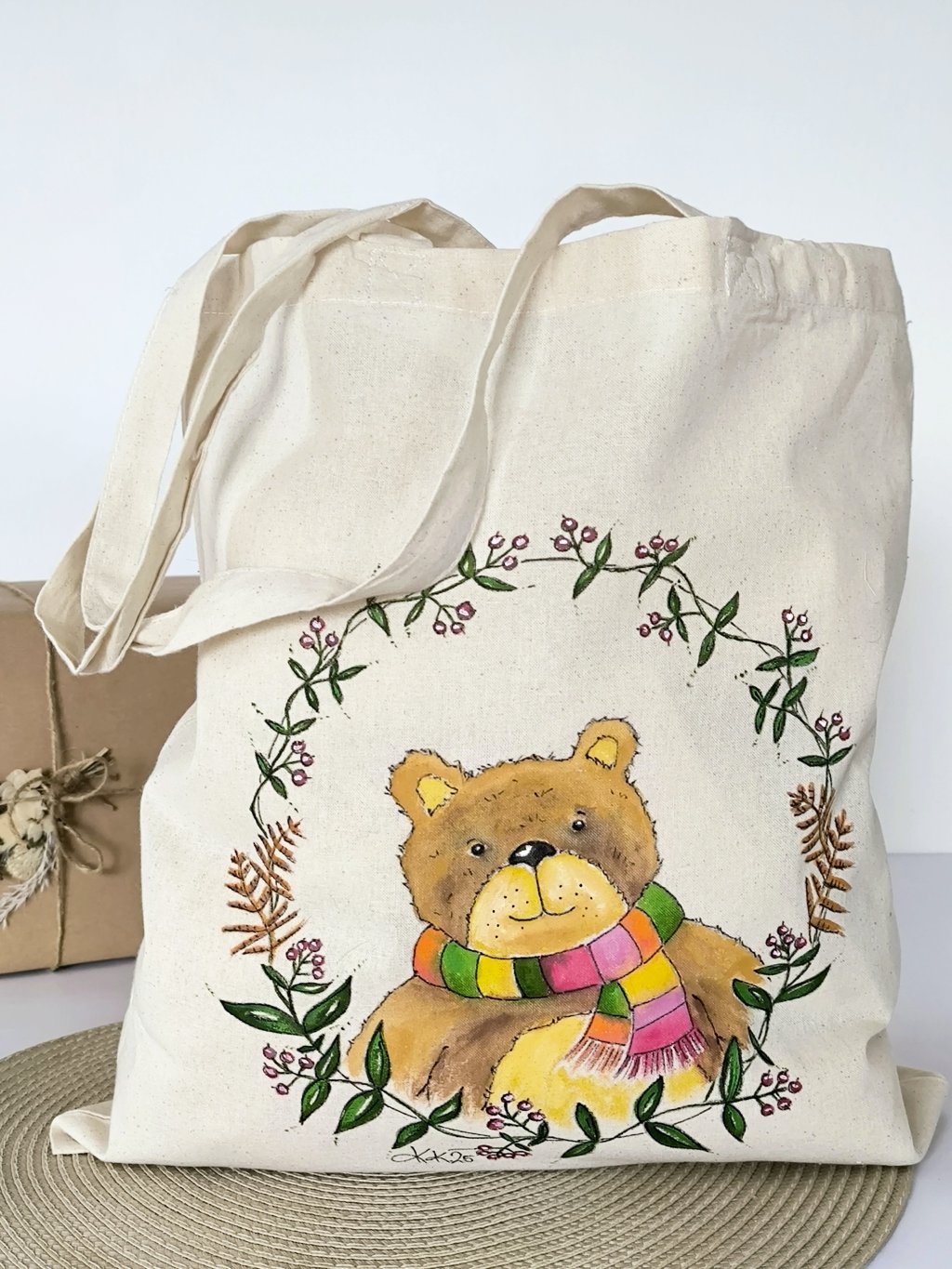 Ručně malovaná nákupní taška s roztomilým medvídkem zaujme a na první pohled. Noste svůj nákup originálně v plátěné tašce, kterou nemá každý.