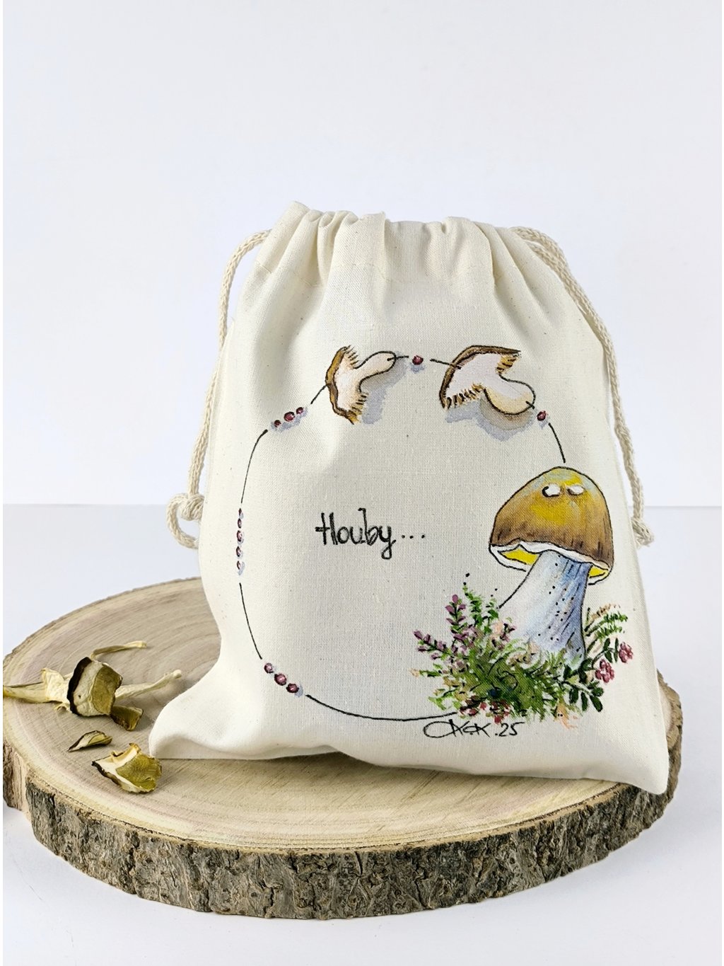 Přineste si malý kousek umění do kuchyně ručně malovaným bavlněným pytlíčkem na sušené houby. Pytlíček je prodyšný, ušitý z přírodní bavlny a mile zútulní vaši kuchyň.