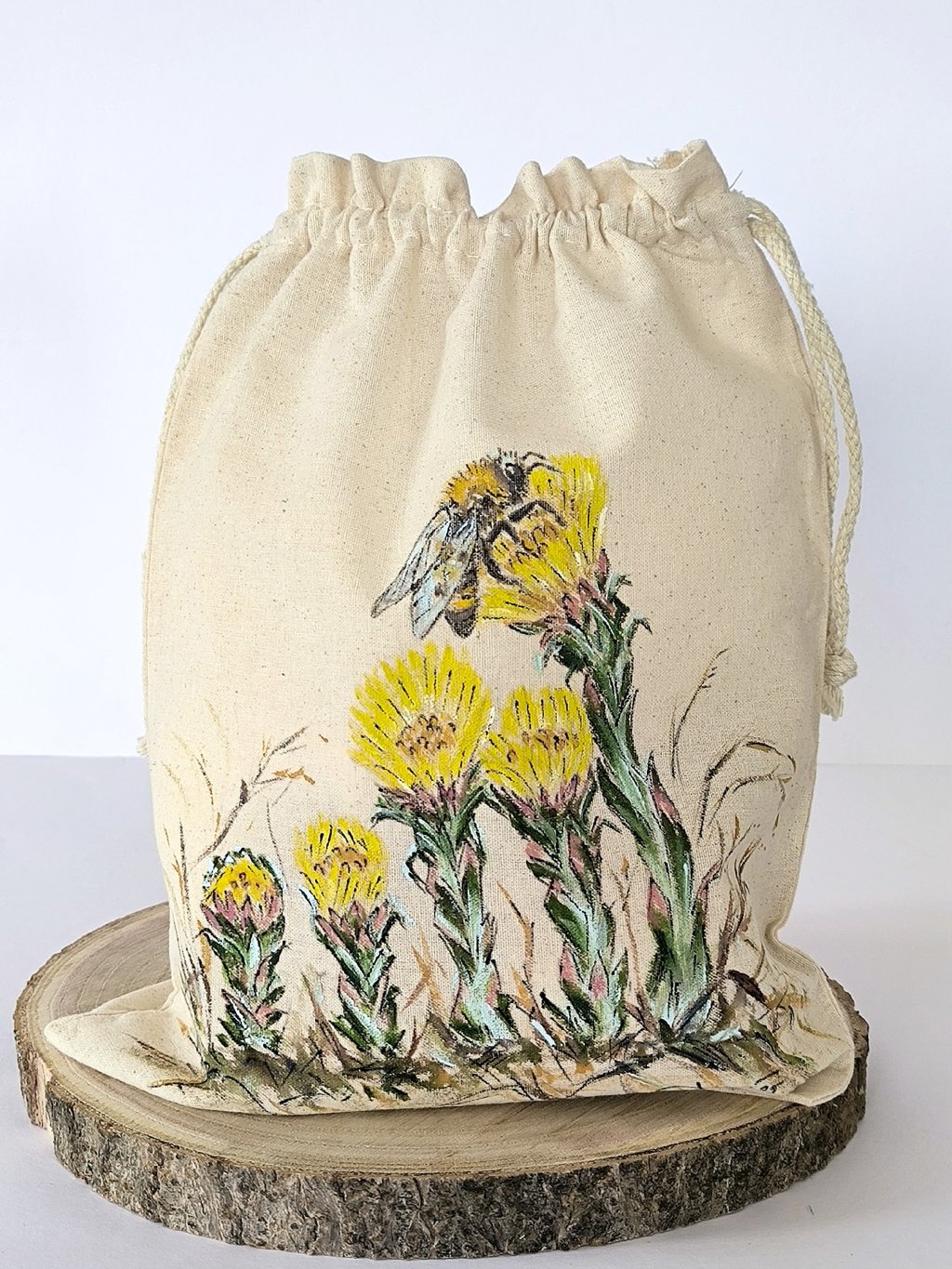 Přineste si malý kousek umění do kuchyně ručně malovaným bavlněným pytlíčkem. V pytlíčku můžete uchovávat koření, bylinky, sušené houby nebo jiné drobnosti.