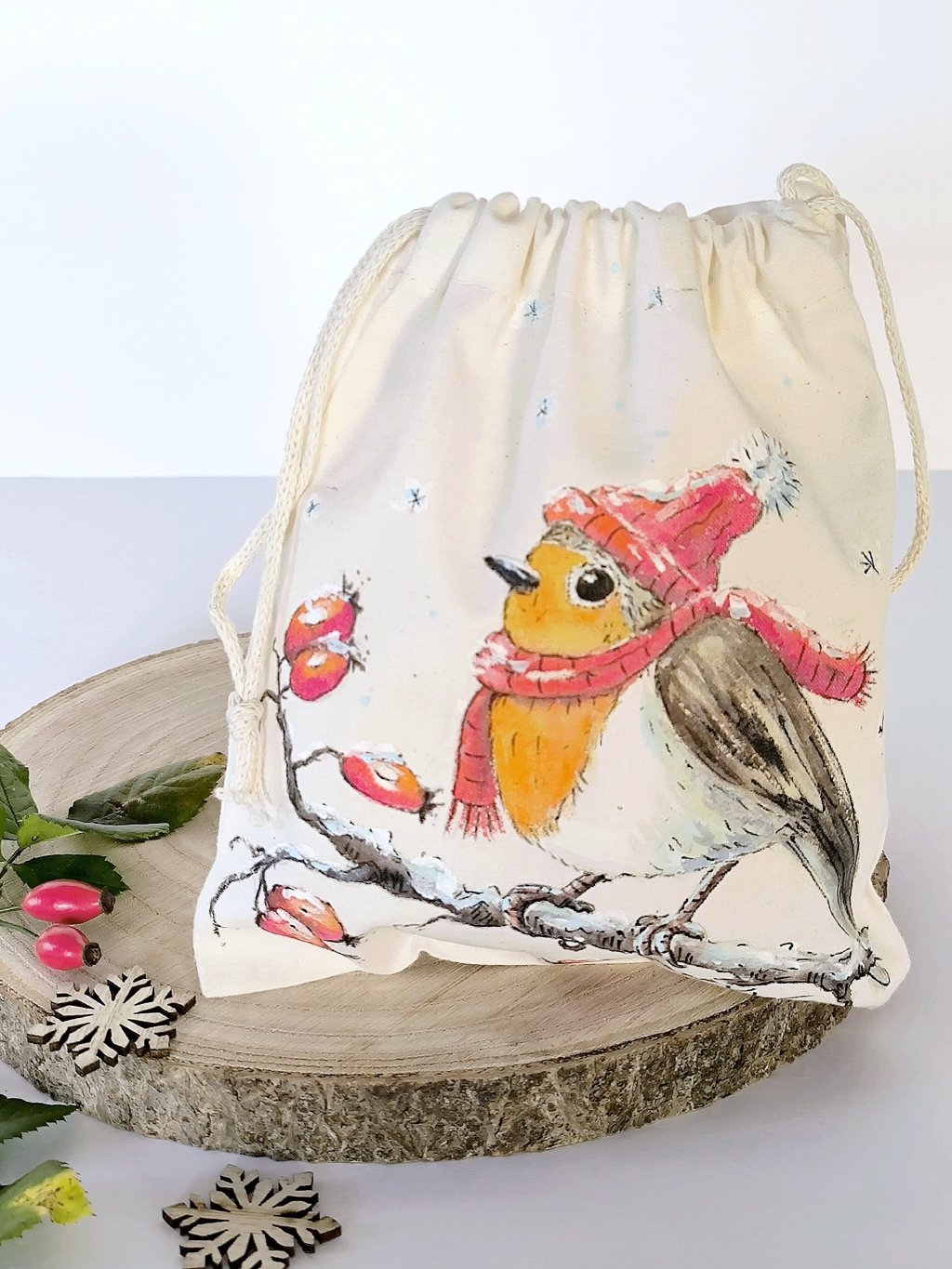 Vánočně laděný pytlíček z bavlněného plátna můžete využít na bylinky, koření, sušené houby a jiné drobnosti, nebo jej můžete využít jako krásný obal na vánoční dárek pro vaše blízké. Obrázek je ručně malovaný.