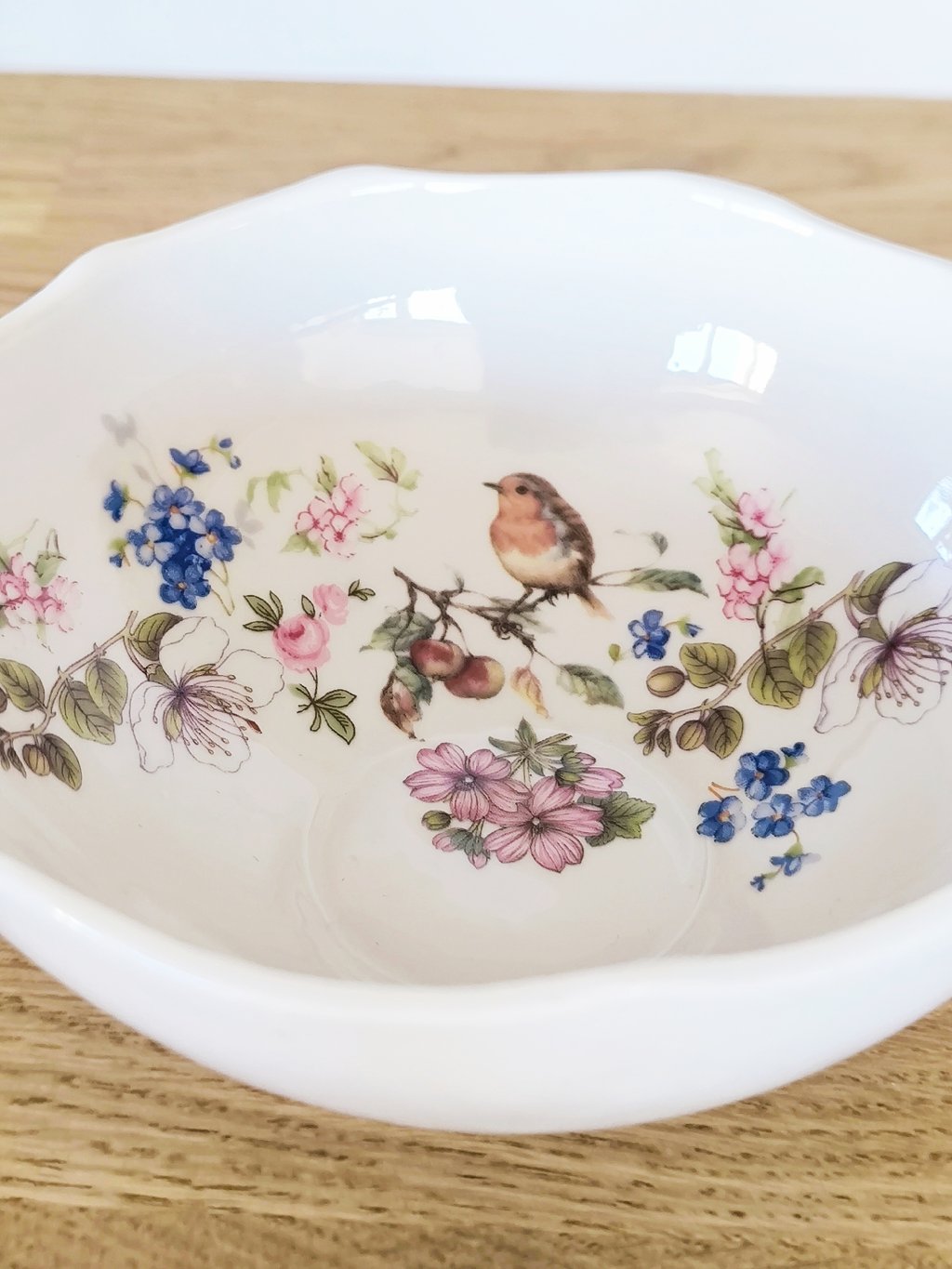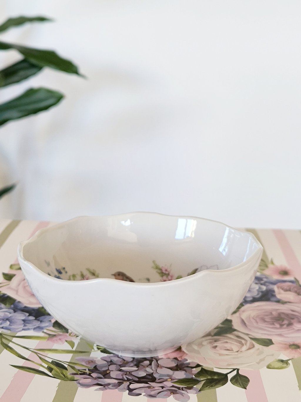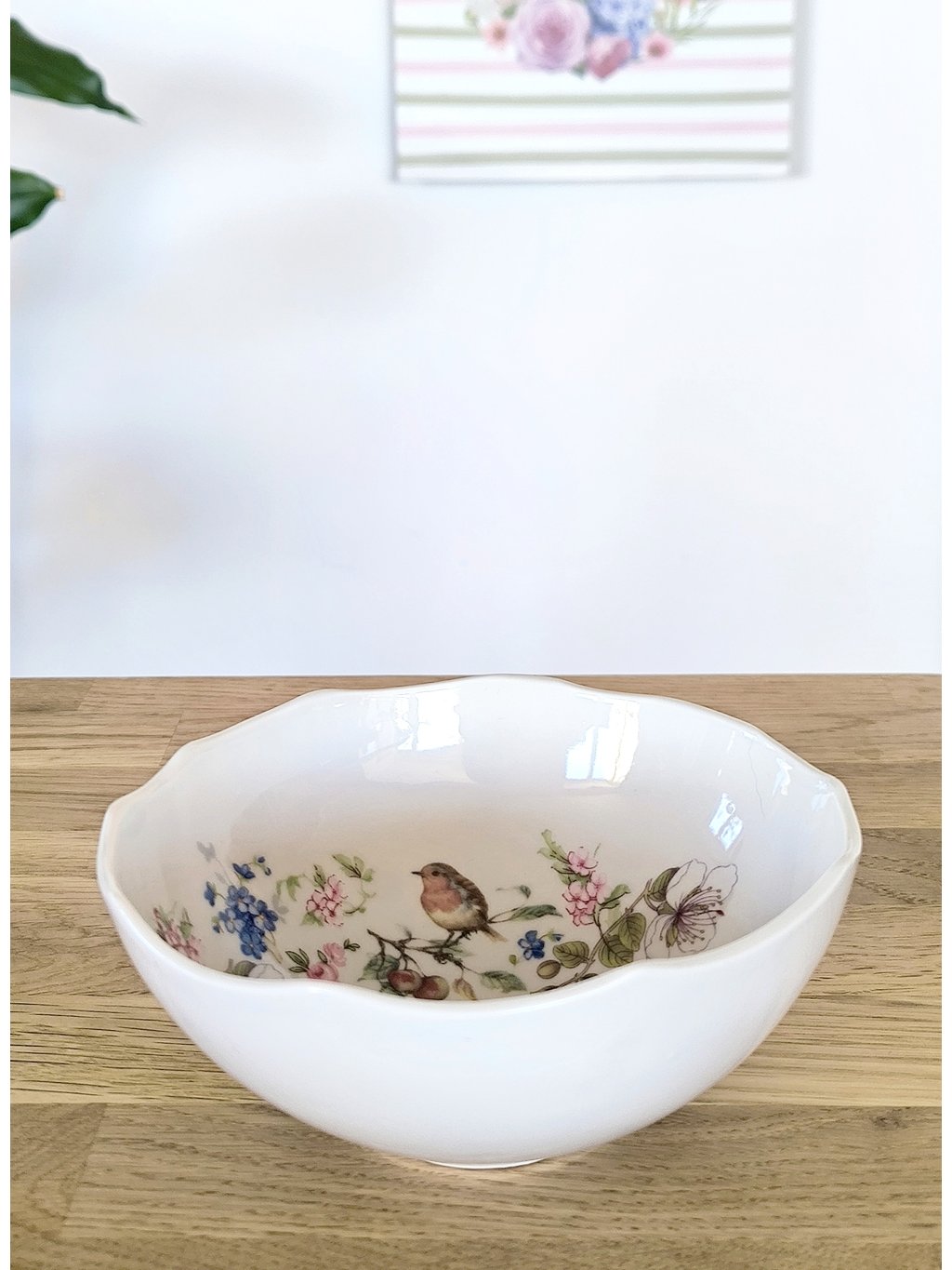Ručně vyráběná porcelánová miska s květinami a ptáčkem pro romantické letní chvíle.