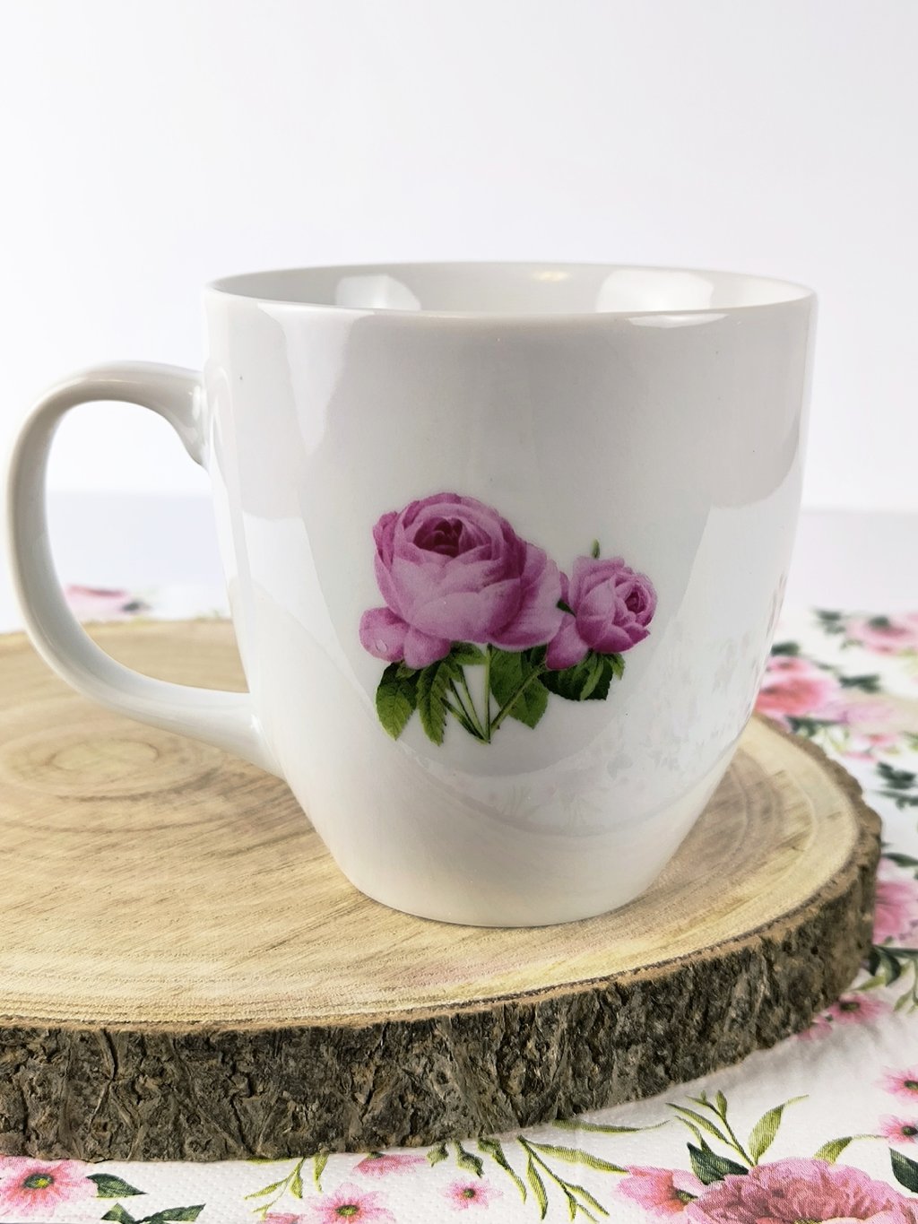 Porcelánový hrníček s krásným dekorem rozkvetlých růží je české výroby a můžete jej využít na čaj, větší kávu, nebo jako hezký dárek pro někoho blízkého. Dekor je z obou stran, z druhé strany je růžička menší.