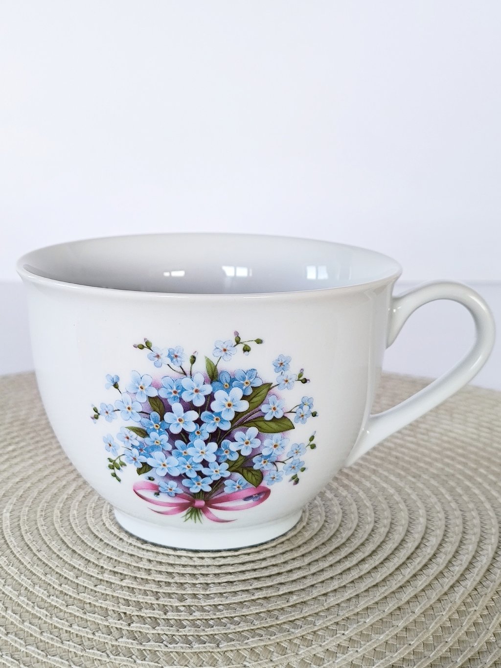 Větší porcelánový hrnek s oblíbenými něžnými pomněnkami na vaši kávu nebo na čaj.