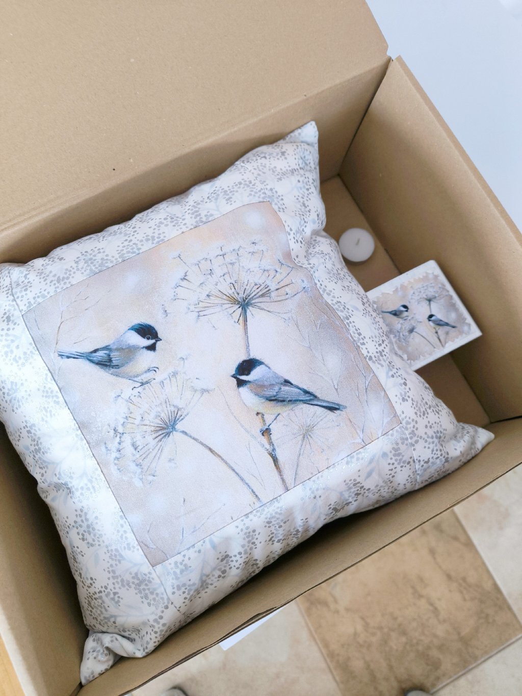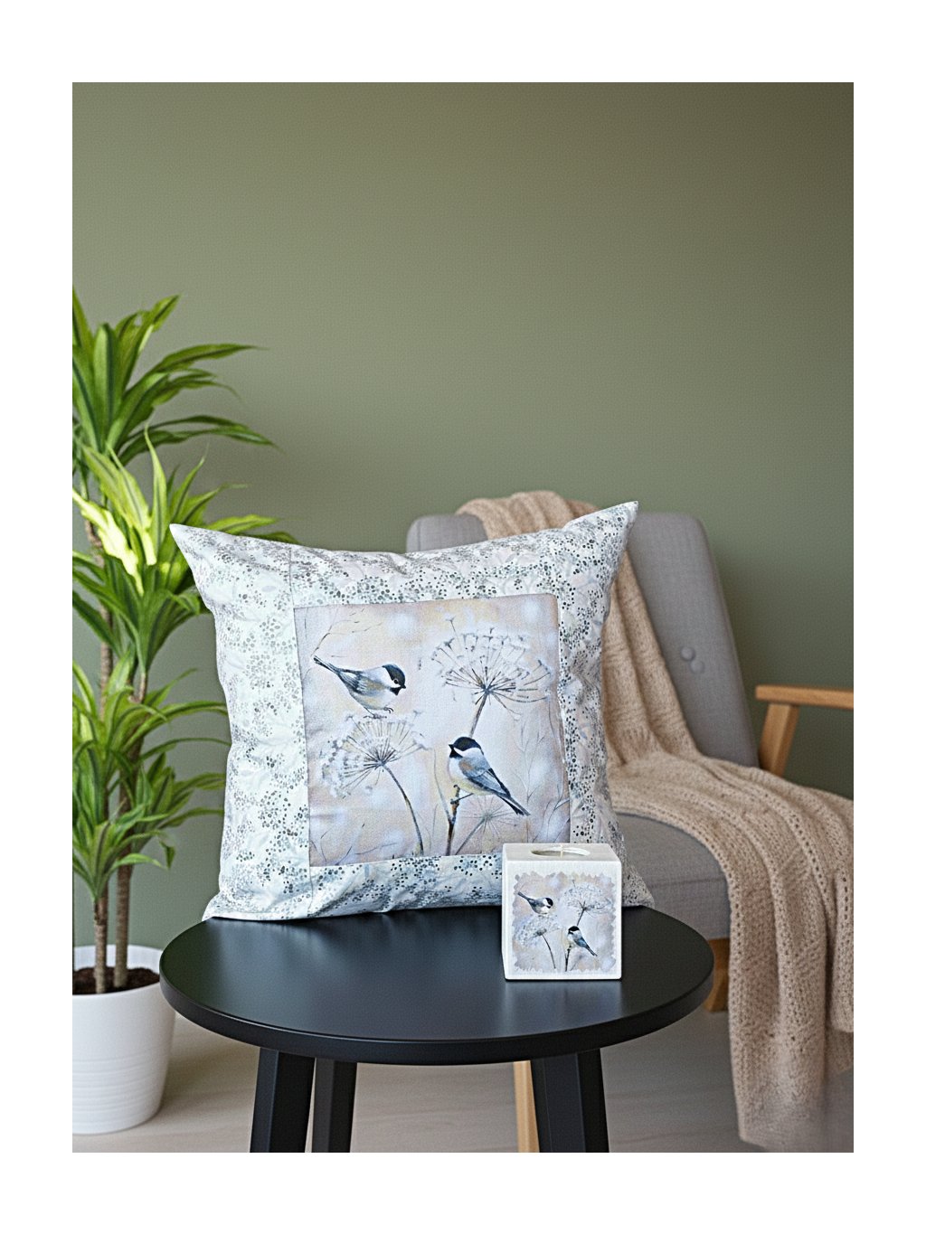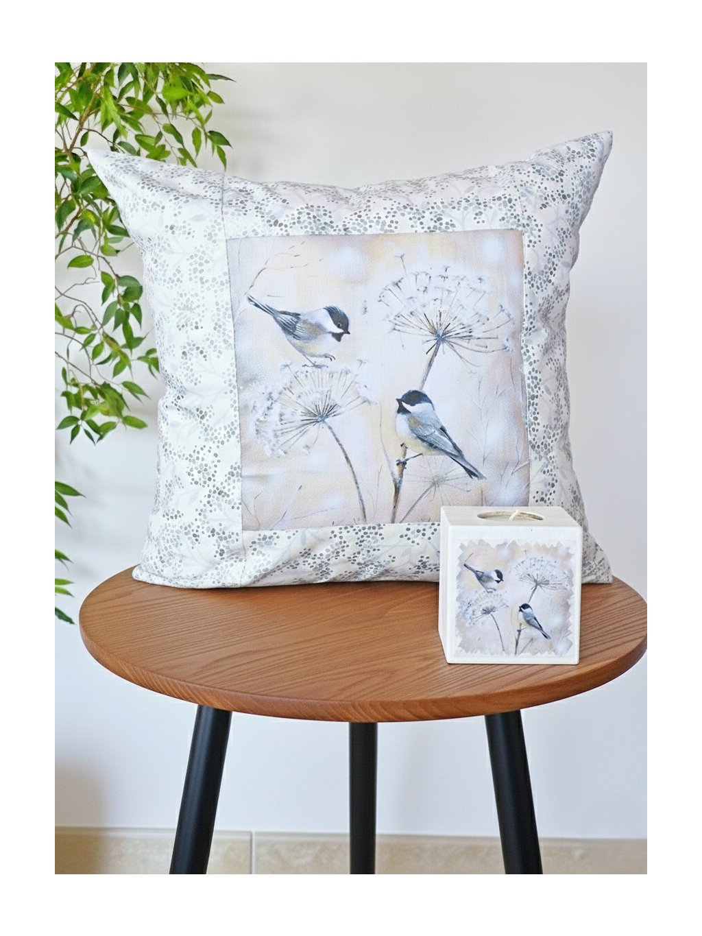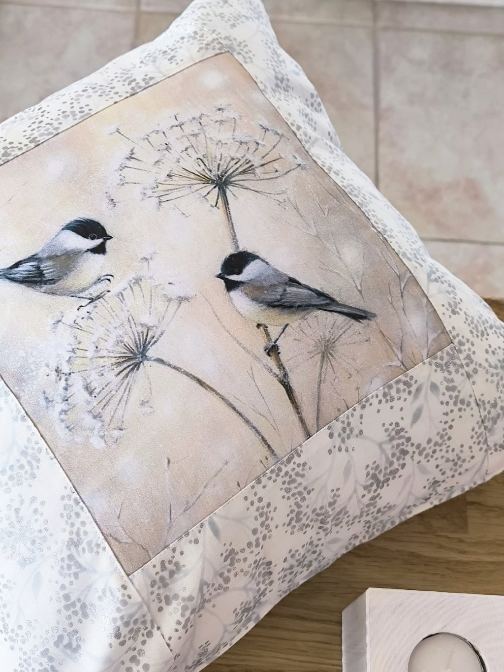 Tento krásný, poctivě ušitý polštářek z velmi kvalitní tzv. americké designové bavlny vám ozvláštní vaše oblíbené křesílko nebo sedací koutek. Když se k tomu přidá dřevěný svícínek se stejným motivem sýkorek, vznikne vám hezky sladěné zátiší, ve kterém si můžete s radostí užívat třeba svou oblíbenou kávu.