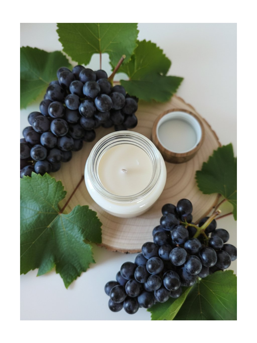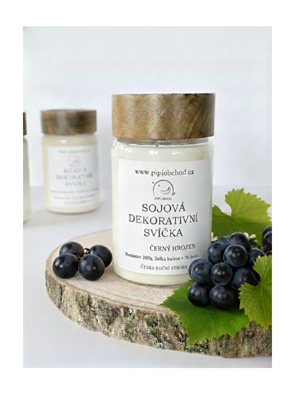 Sójová svíčka ruční výroby se smyslnou vonnou kompozicí černých hroznů. Hoří čistě a rovnoměrně, má dlouhou výdrž a je šetrná k přírodě. Svíčka je ručně odlévaná do skleněné nádoby s dřevěným víčkem.
