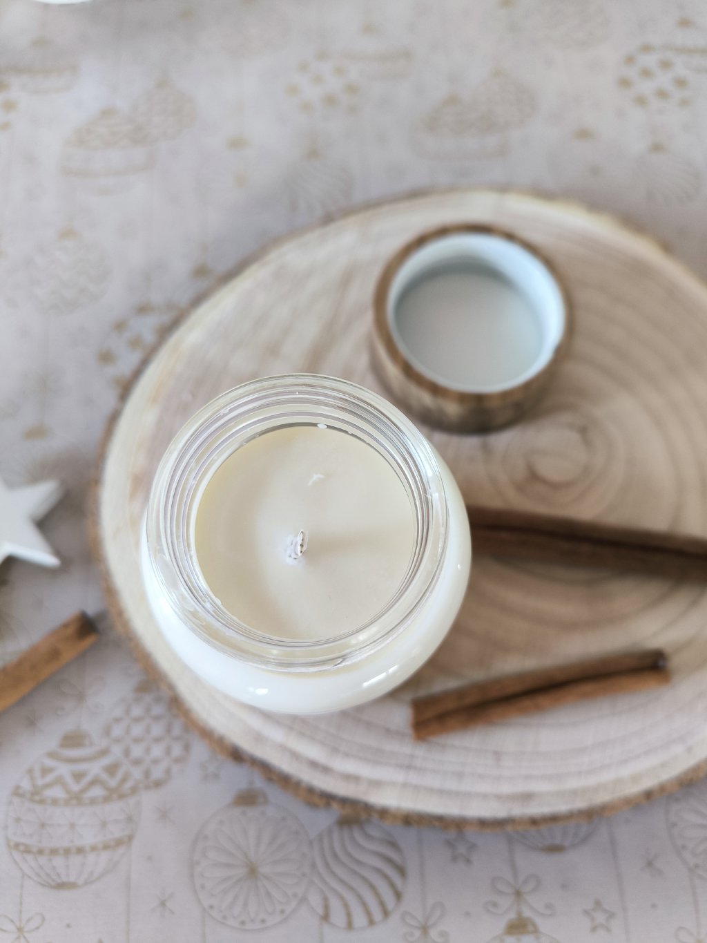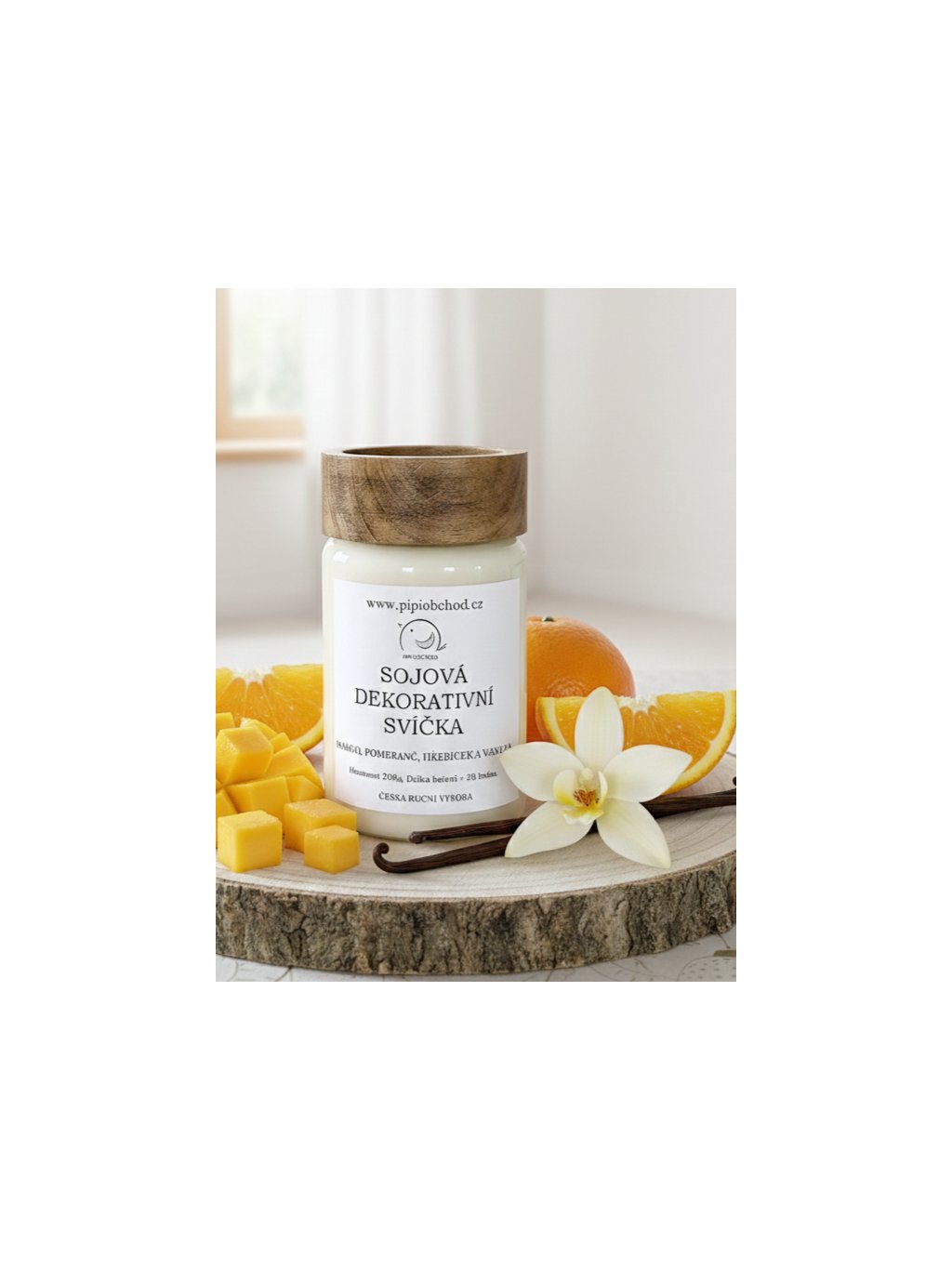 Složení: 98% sojový vosk - Hydrogenated soybean Oil, 2% vonná kompozice obsahující: Limonene, Eugenol, PIPERONAL, Linalool, Citronelool, Linalylacetate, 2-Methyl -3- (4-isopropylenphenyl), propanal, Melonal, Citral, Geranyl Acetate, EXALTOLIDE TOTAL, Betapinoil 1-(1, 2, 3, 4, 5, 6, 7, 8-Octahydro-2,3,8,8-tetramethyl-2-naphtyl)ethan-1-one, bavlněný knot. Svíčka je ve skleněné nádobě s dřevěným uzávěrem. UFI: AXX2-2913-100R-MXKE. Může vyvolat alergickou reakci. Při styku s kůží omyjte vodou a mýdlem. Škodlivý pro vodní organismy. Vyrobeno 11/2025.