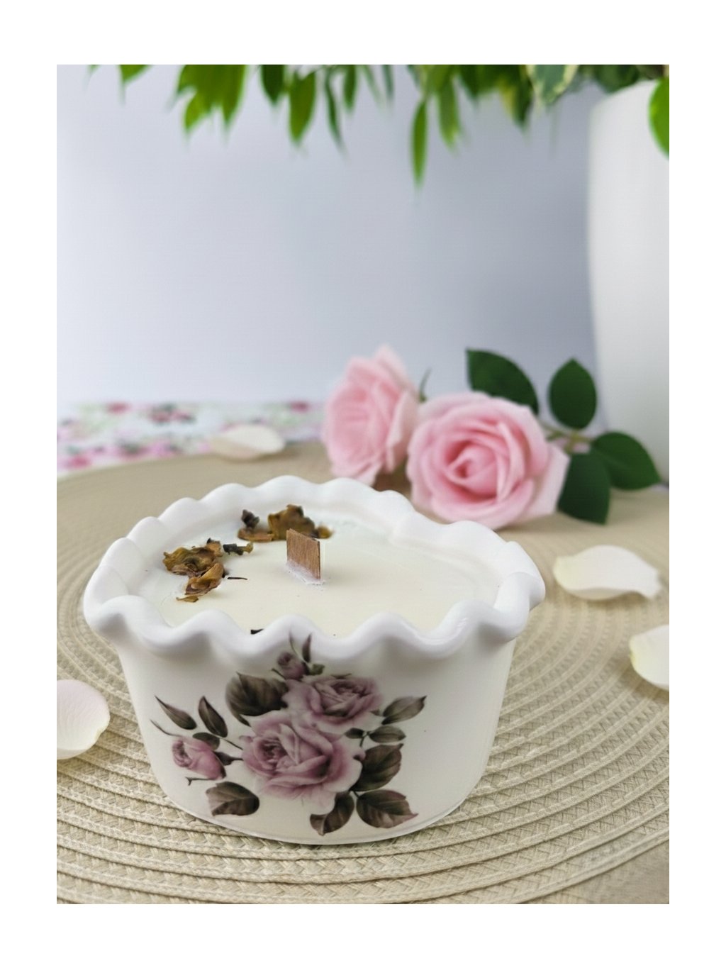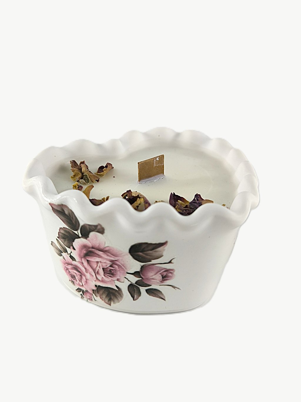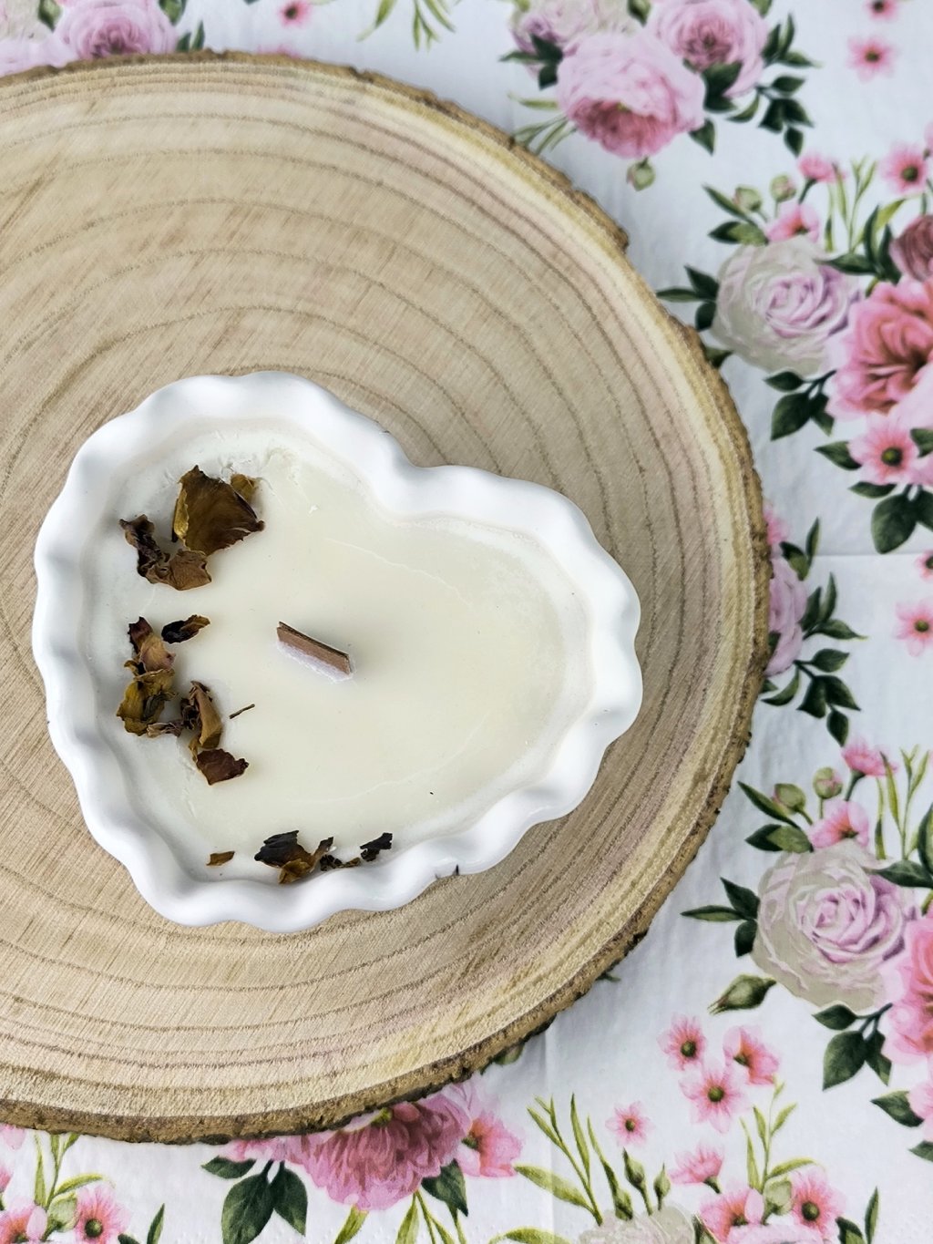 Voňavá svíčka v keramické misce ve tvaru srdíčka ozdobená plátky sušených růží vás vnese svou jemnou vůní do romantické růžové zahrady. Dodáme v dárkové krabičce.