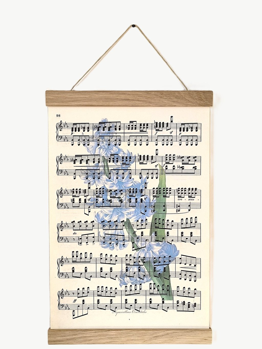 Oblíbená voňavá jarní květina - modrý hyacint je vytištěný na autentickém notovém papíře z roku 1910. Přinese vašemu domovu spojení elegance přírody a kouzla hudební historie. Tento originální tisk přináší do vašeho interiéru romantickou vintage atmosféru s dotekem starých časů.