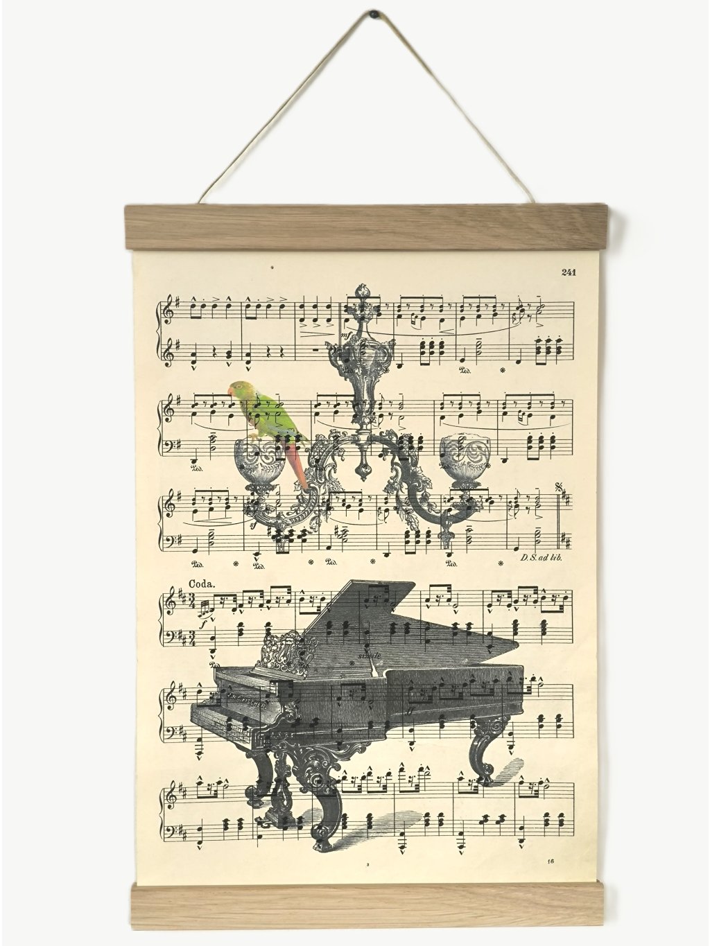 Tento obrázek nejenže obohatí váš interiér, ale vnese do něho kousek historie. Klavír a papoušek sedící na lustru jsou totiž vytištěni archivačním inkoustem na starém notovém papíře, který pochází ze začátku minulého století! Každý kus notových obrázků je originál. Jedinečný dárek pro milovníky umění a historie.