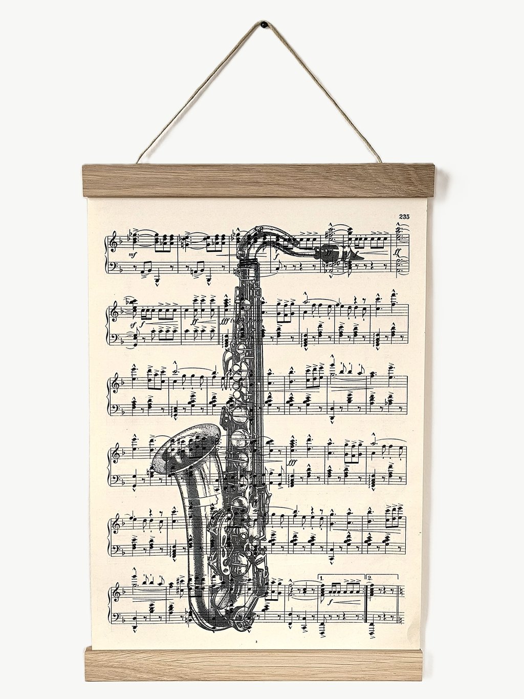 Saxofon je vytištěn archivačním inkoustem na starém notovém papíře, který pochází z roku 1900! Každý kus notových obrázků je originál.