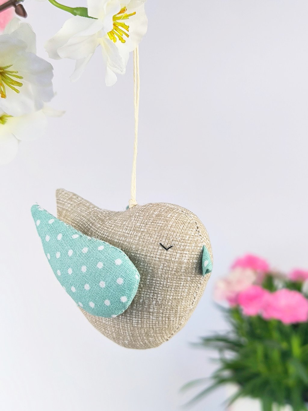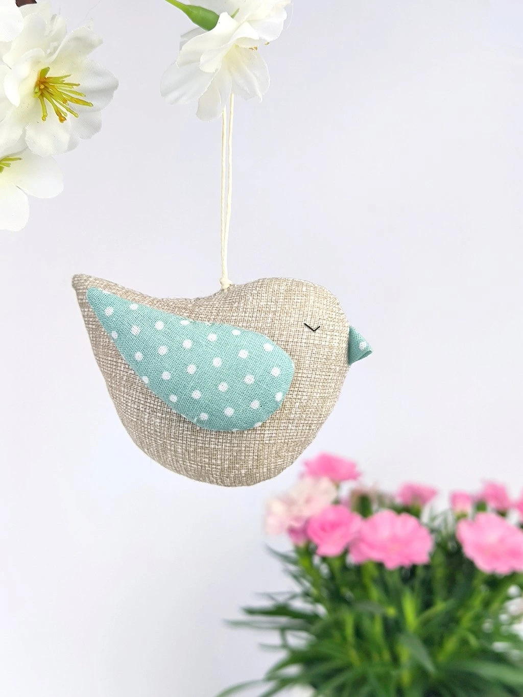 Bavlněný ptáček má očko na zavěšení. Je ušitý z bavlněné látky, vnitřek je vyplněný dutým vláknem.