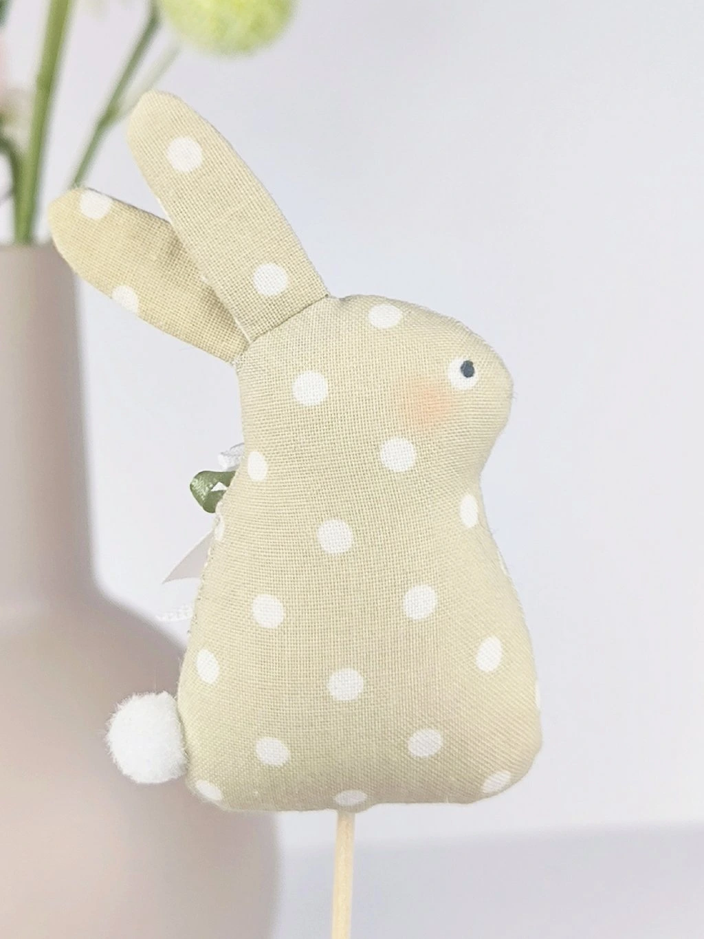 Jarní dekorace na ozdobení vázy, truhlíku nebo květináče. Zajíček z hezké béžové bavlněné látky navodí tu správnou jarní atmosféru. Zajíček je na špejli, kterou je možné vyndat.