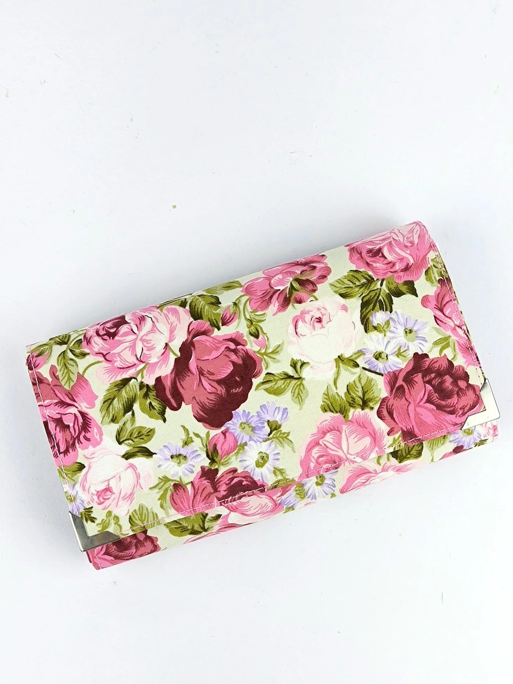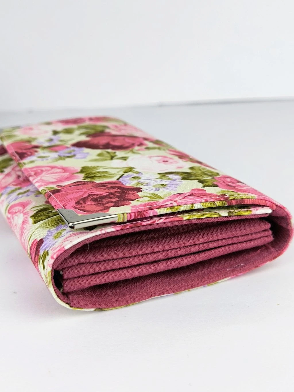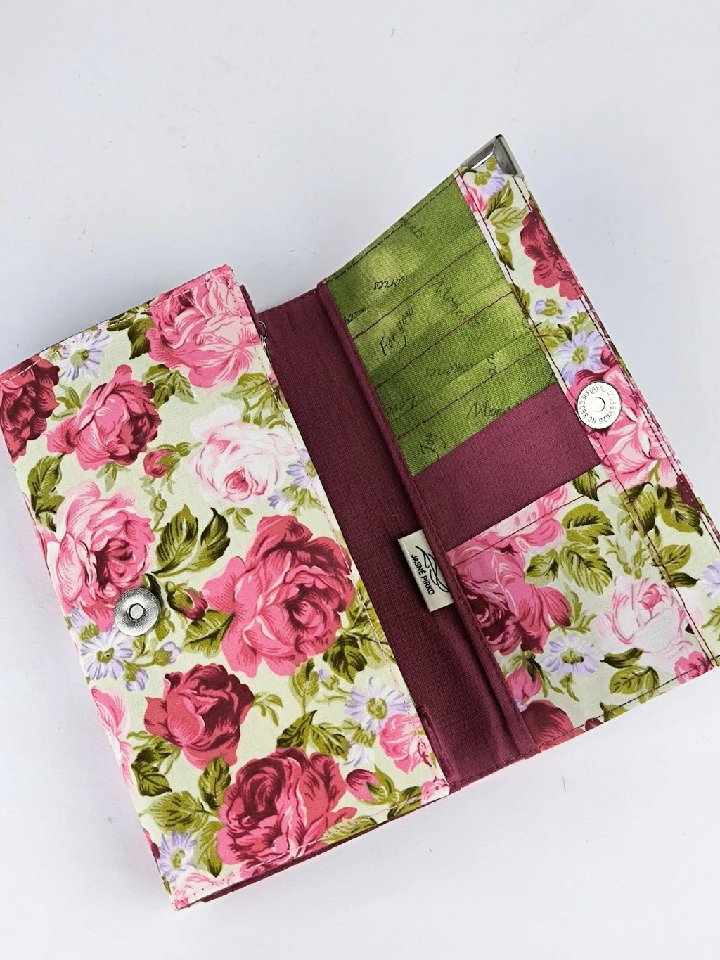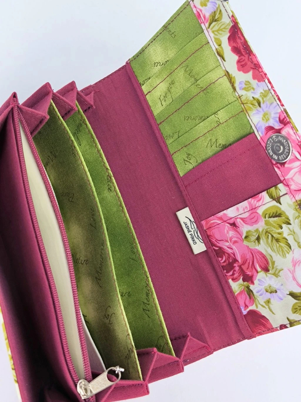Peněženka je české výroby, je pečlivě ušitá z krásné bavlněné designové látky s růžemi, má kovové rohy, které brání oděru a je vyztužena několika druhy brašnářského lepení, aby dobře držela tvar.