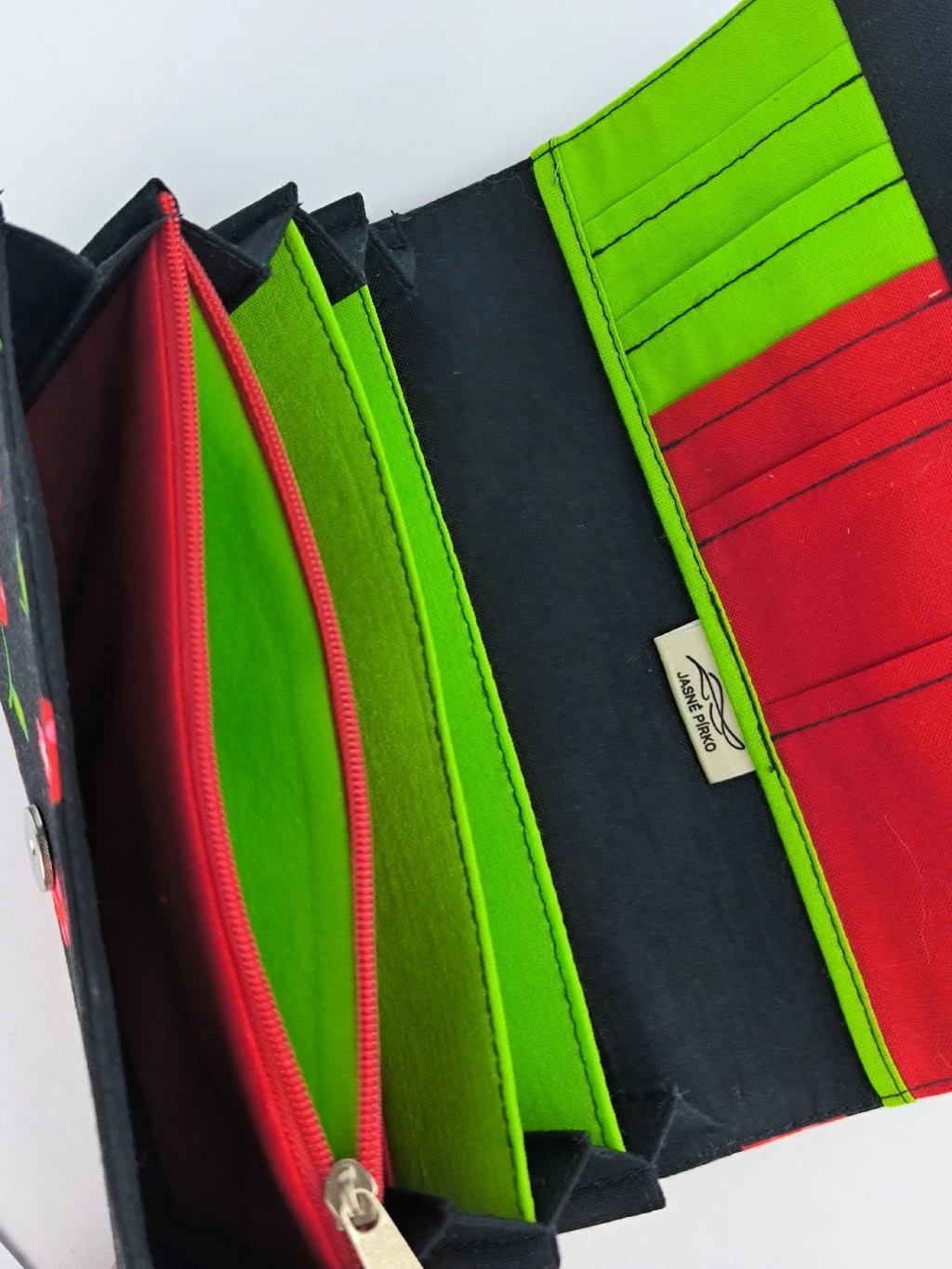 Rozvržení peněženky: po otevření je na na pravé straně jedna velká spodní kapsa a malých 5 kapsiček na doklady či karty. Na levé straně jsou 4 přihrádky a kapsa se zipem na mince. Zip je ozdobený kovovým přívěskem.