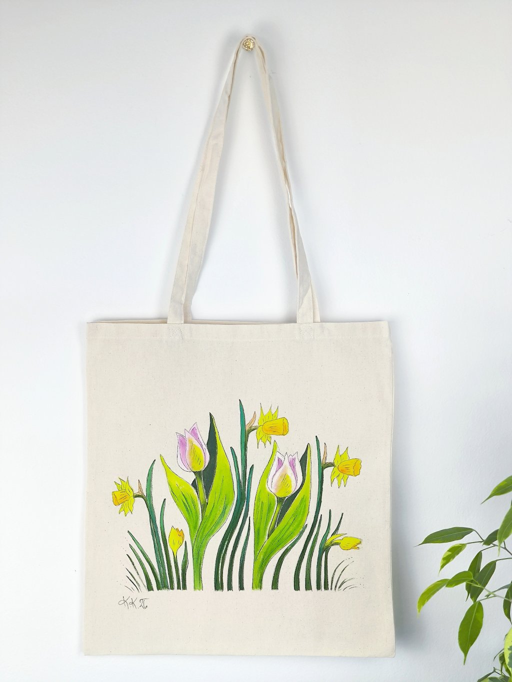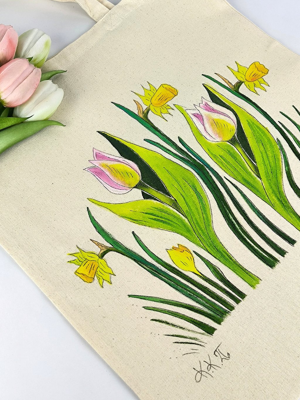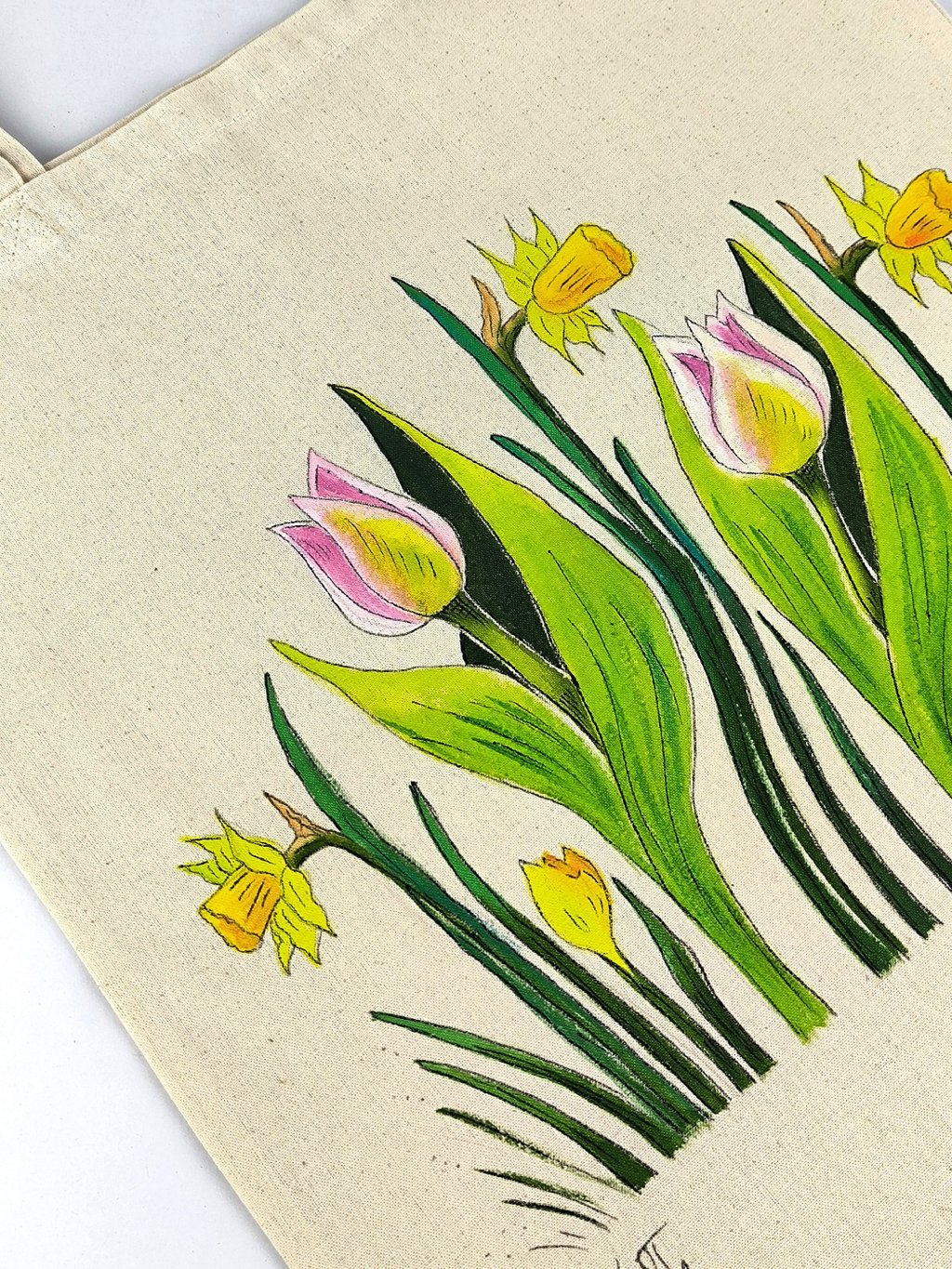Rozveselte si jarní dny ručně malovanou plátěnou taškou s nejoblíbenějšími jarními květinami - narcisy a tulipány. Každý kus je originál – žádná taška není úplně stejná!