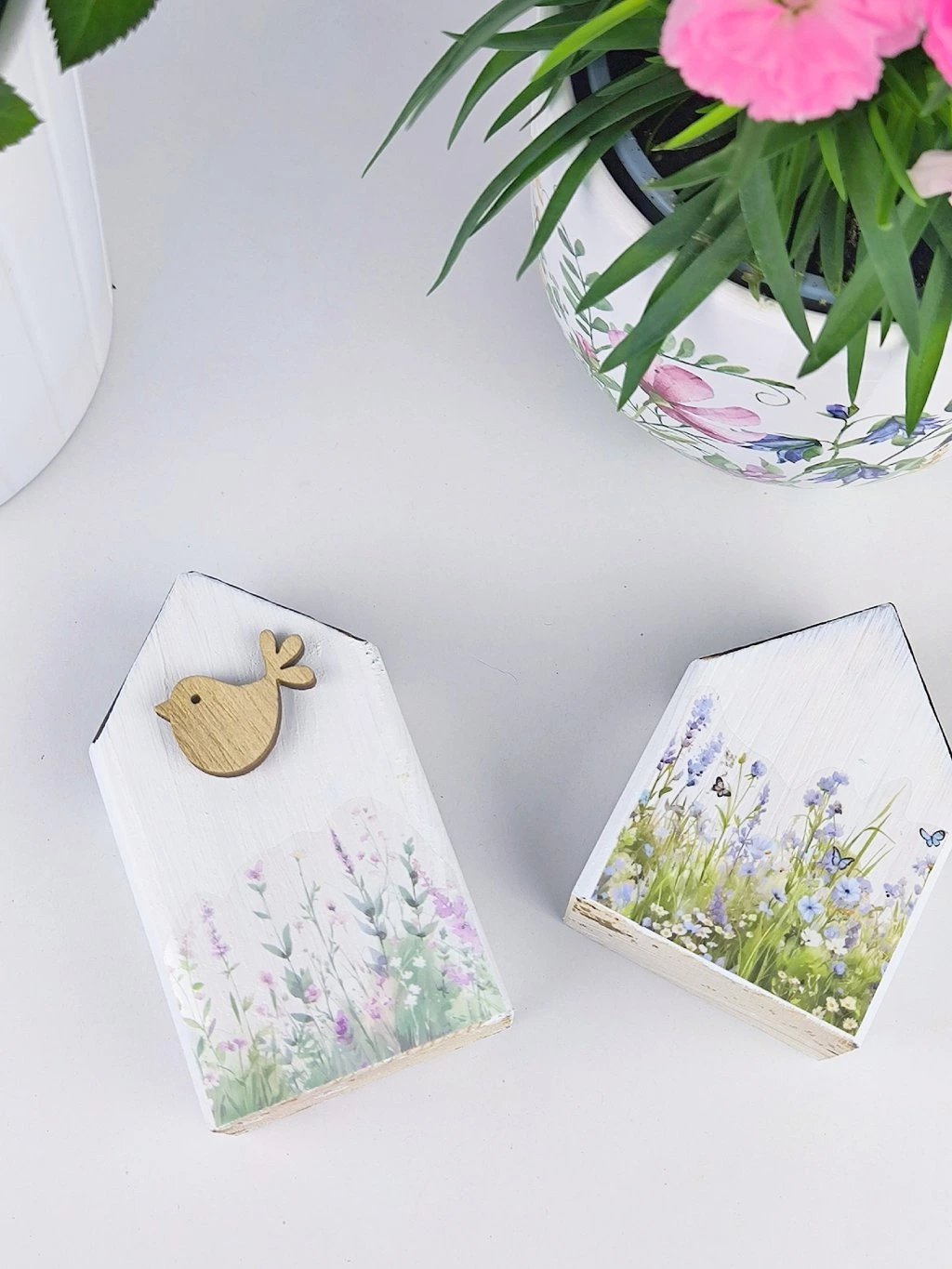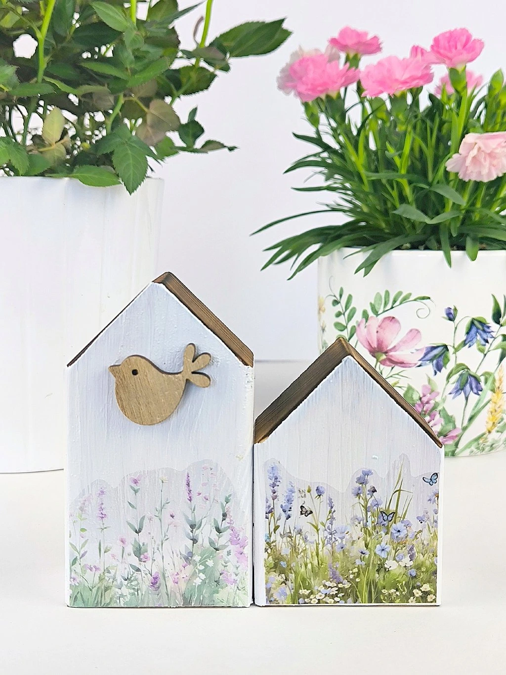 Maličkosti dělají domov. Vyzdobte si parapet nebo poličku dřevěnými domečky, krásně budou vypadat například vedle květinové dekorace.