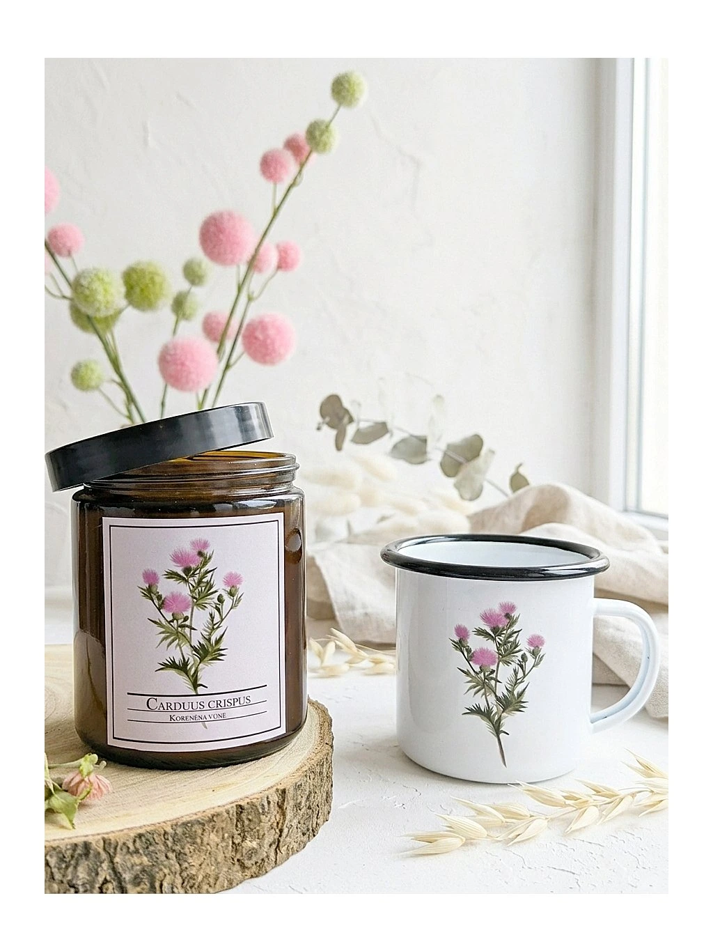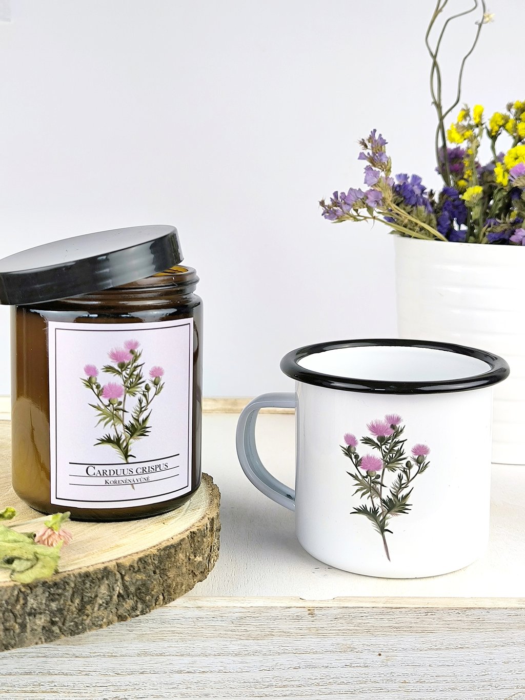 Plecháček s krásnou autorskou ilustrací s bodlákem hezky ladí s ručně vyráběnou vonnou svíčkou, na které je stejný obrázek.